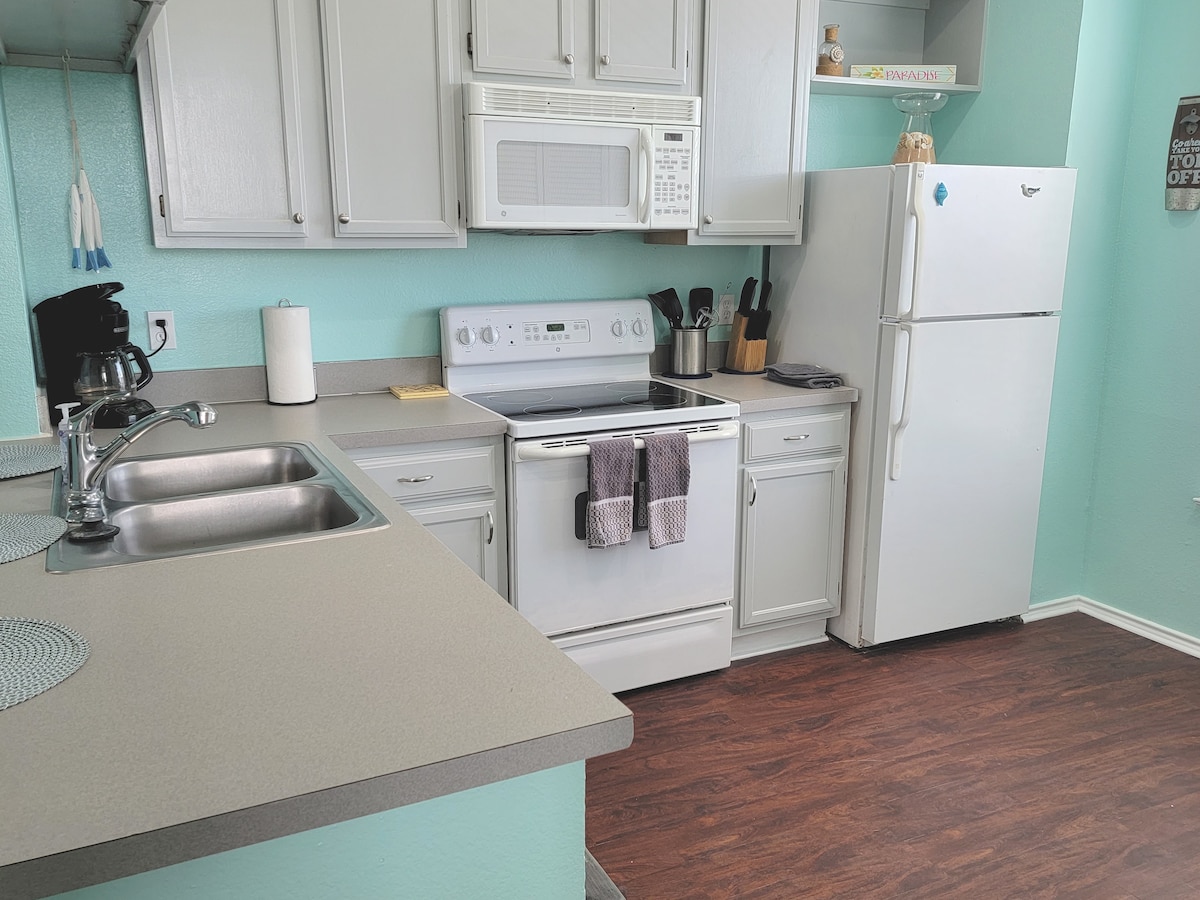 Bienvenido a nuestro Gulf Coast Condo, tu hogar lejos de casa en la maravillosa isla North Padre. Disfruta del café por la mañana o del vino por la noche desde nuestro balcón privado del segundo piso con vistas al mar y la brisa de la playa. Nuestro apartamento tiene capacidad para cuatro personas con espacio adicional adecuado para un colchón inflable. Durante tu estancia, disfruta de un corto paseo de cinco minutos hasta la playa de Whitecap, o puedes elegir una comodidad en el lugar como la piscina/bañera de hidromasaje, muelle/estanque de pesca privado, sauna, cenador con parrilla o gimnasio. También ofrecemos cable y wifi.