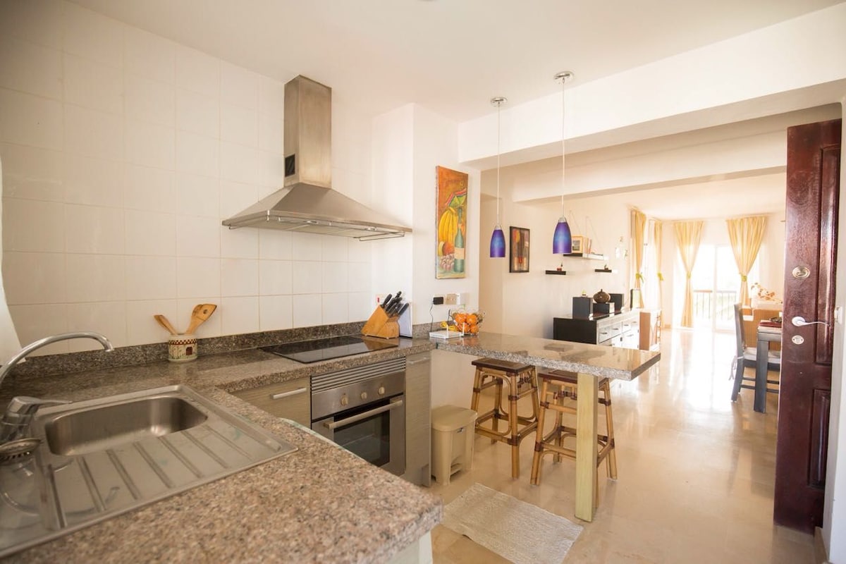 Te damos la bienvenida a nuestro departamento frente a la playa, donde el mar no es solo una vista, sino parte de tu experiencia diaria. Nuestro alojamiento de dos dormitorios y dos baños se encuentra justo enfrente de las aguas turquesas de la playa Bávaro, a solo cinco pasos de la arena. Situado en el tranquilo extremo de la franja, disfrutarás de un ambiente más relajado mientras te mantienes a poca distancia de restaurantes, tiendas, panaderías y farmacias.