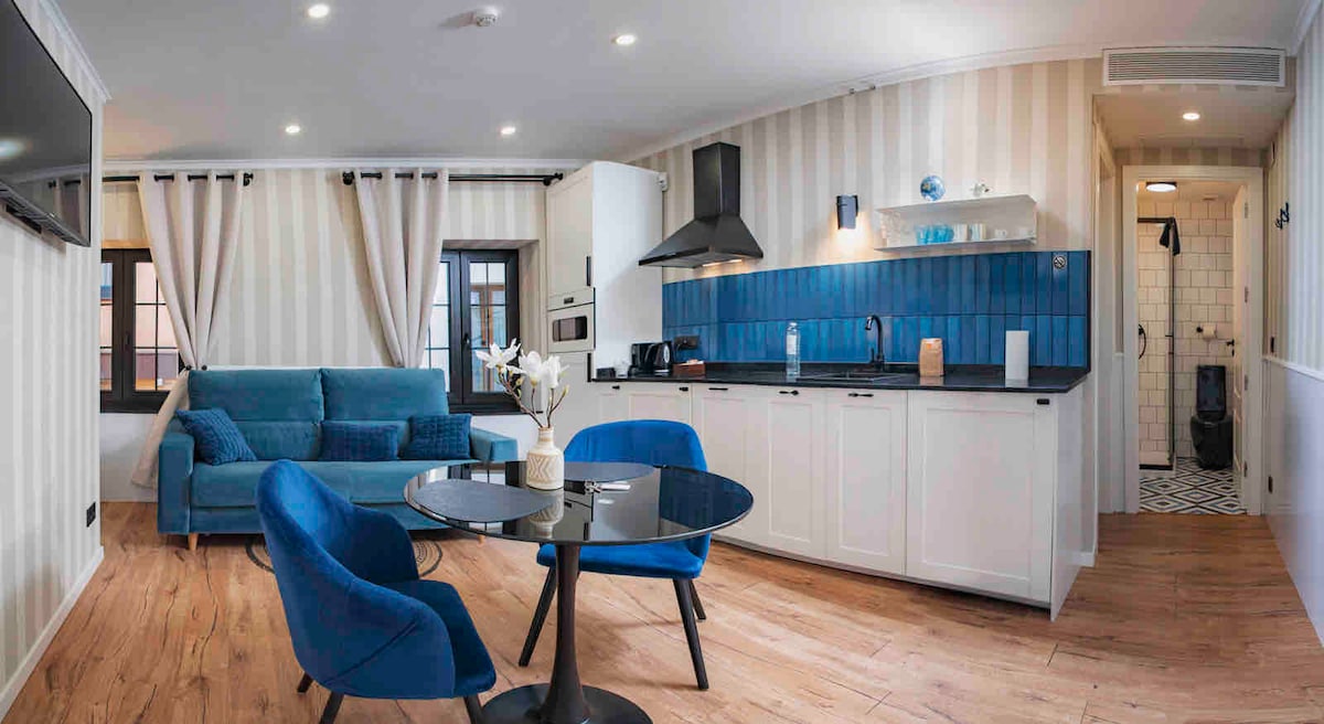 Estudio superior con todas las comodidades y servicios, tienes acceso al SPA privado, una vez confirmada la reserva os facilitamos el enlace para reservar la hora, el espacio se cierra para ti solo algo muy exclusivo e inusual por la zona. Es una hora por noche pernoctada. En el estudio dispones de una cocina totalmente equipada con los utensilios básicos para cocinar, una baño muy amplio y gran cantidad de armarios para guardar tu ropa. Te facilitamos albornoz y sandalias para el acceso al SPA.