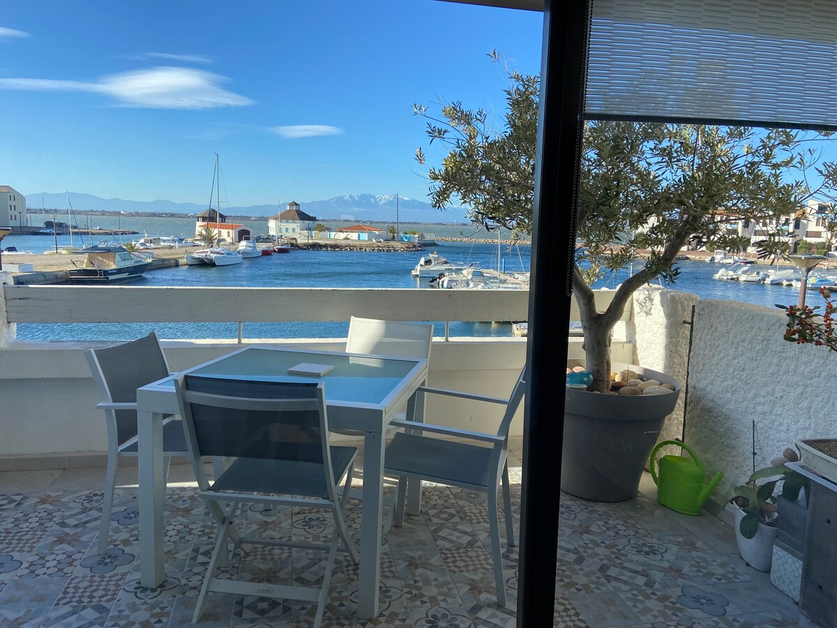 Appartement standing sur la marine avec vue canigou coucher du soleil pour 4 personnes climatisé 1 chambre avec lit en 160 et placard 1 chambre avec canapé lit en 140 de qualité et placard cuisine équipée avec îlot central tous les ustensiles pour cuisiner,cafetière nespresso, grille pain... deux grandes baies vitrées donnent sur une grande terrasse équipée avec store banne tout commerce a 50 mètres, piscine collective, tennis, city stade places de parking privée location du samedi au samedi