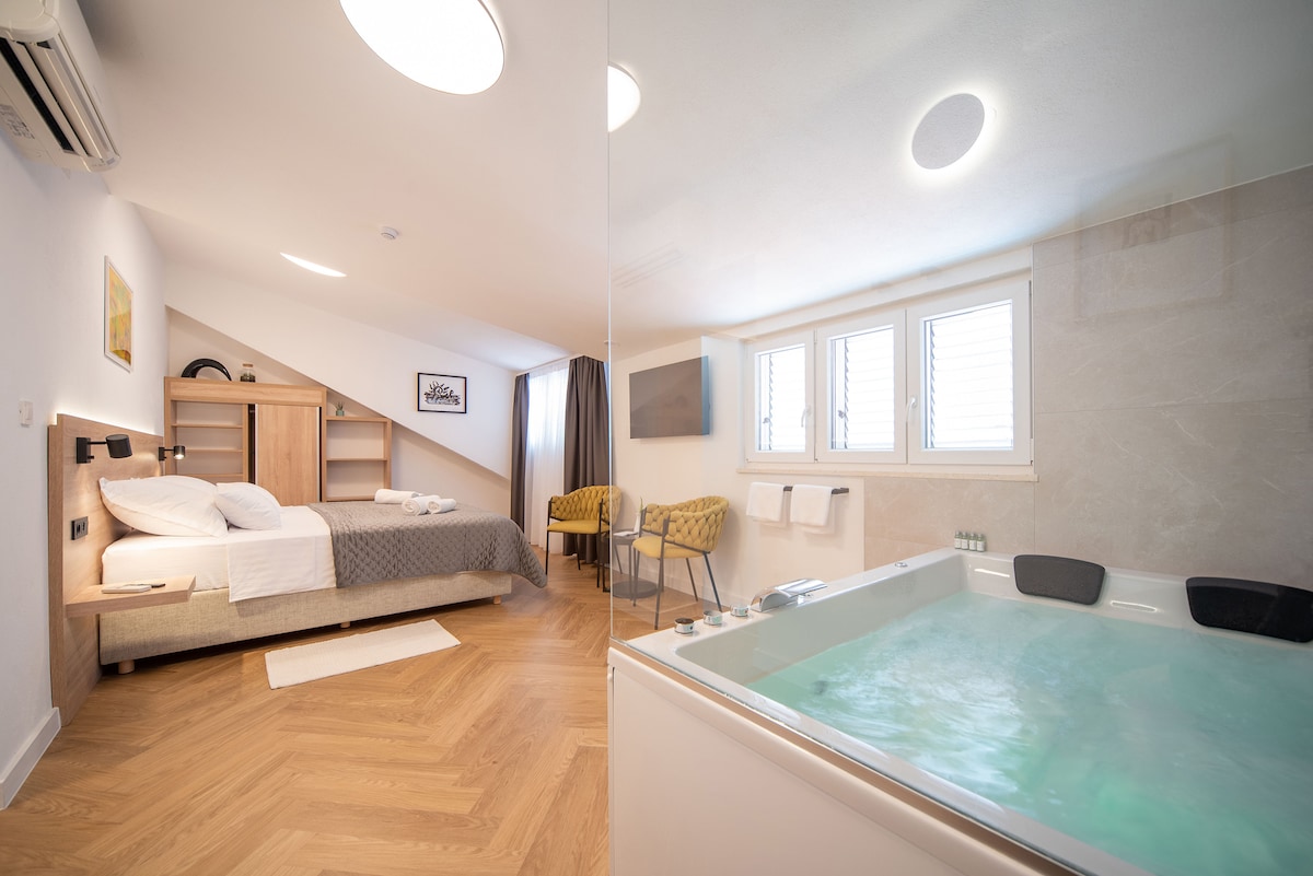 Habitación Deluxe con jacuzzi privado y sauna finlandesa, ubicada en el centro de la ciudad, en el corazón del casco antiguo de Split, declarado Patrimonio de la Humanidad por la UNESCO. Completamente equipado, con aire acondicionado, Internet WI-FI, TV LCD con canales por cable y ventanas insonorizadas. ¡LA MEJOR UBICACIÓN, cerca de todo!