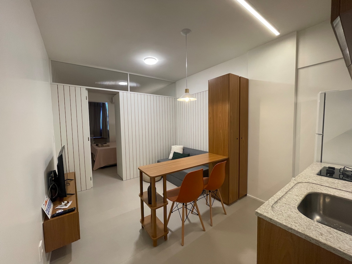 Kit Studio: sala de estar, cocina, suite, garaje interno y ascensor. ¡Ideal para tu alojamiento en Brasilia! Cómoda cama matrimonial, colchón nuevo (abril de 2025) de gran calidad, ropa de cama, baño, utensilios de cocina, todo nuevo, microondas, licuadora, sandwichera, aire acondicionado, minibar, TV inteligente, Wi-Fi, conserje de comedor las 24 horas, cerradura electrónica, condominio seguro y tranquilo con cámaras internas y externas. Ubicación espectacular. Barrio noble en Brasilia, DF