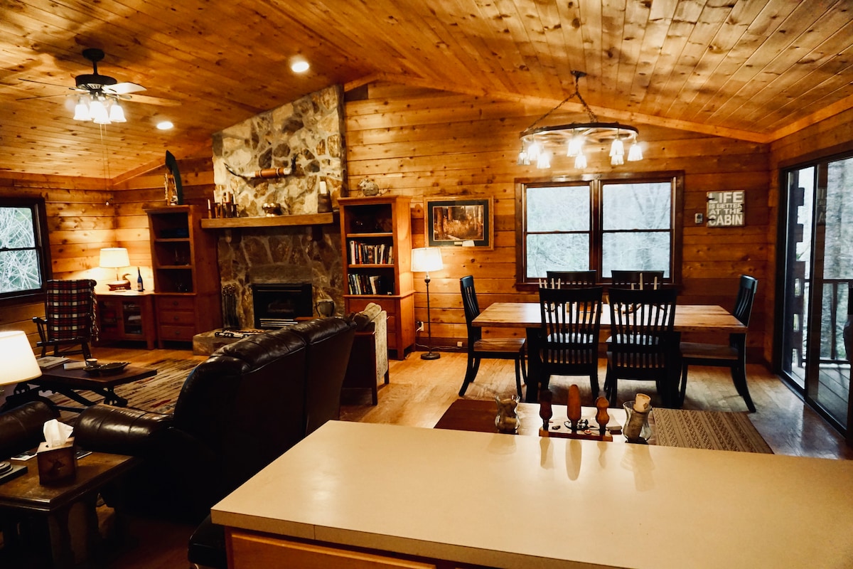 Our secluded mountain retreat is a split cedar log cabin situated on a hill above a roaring mountain stream with a view of Little Falls across the creek. What an amazing view (and relaxing sound) right off the back deck! Adjoining the property is a neighborhood park easy access to the water. The cabin has rustic an open concept centered around a 2-story stone fireplace. The perfect escape for rest and relaxation. PLEASE NOTE: It is 12 miles and a 35 minute drive to downtown Highlands