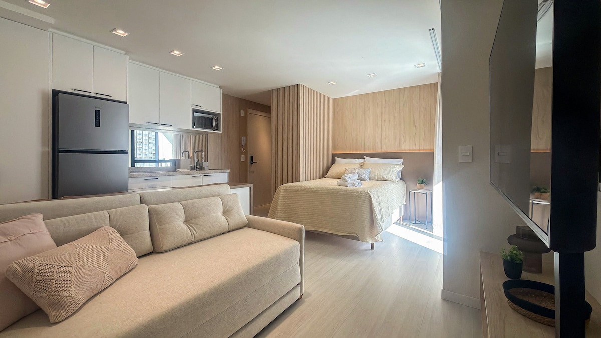 Estudio completo para (2) dos personas, con plaza de aparcamiento, situado a (1) una manzana de la PUC. Con aire acondicionado, wifi de gran velocidad, Smart TV, cama doble, cocina equipada, ropa de cama y baño, champú, jabón, escritorio, secador de pelo, plancha, junto a Shopping Estação, Carrefour y otros mercados, panaderías y restaurantes. Es súper cómodo con toda la seguridad, con llegada/salida autónoma.
