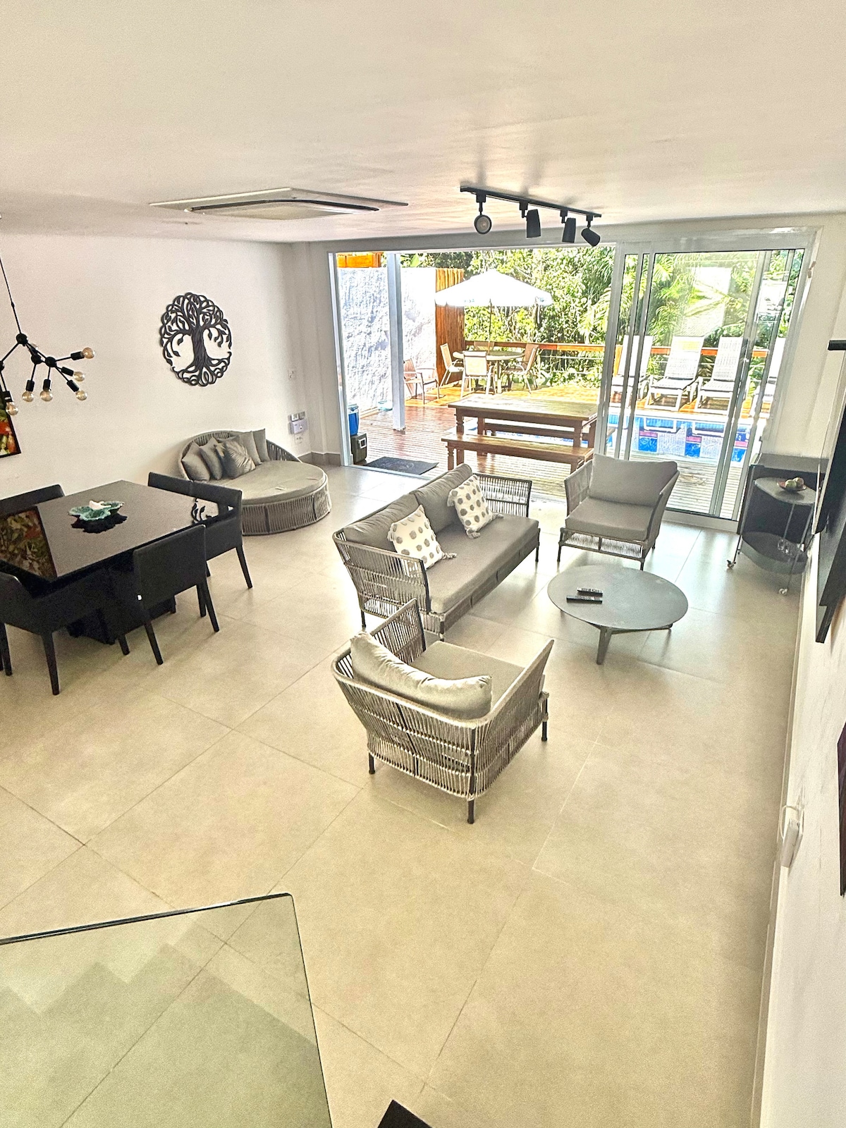 Casa con estilo y comodidad , suite de 5 estrellas (ducha de gas y bañera grande para dos con agua, aire acondicionado, ventilador de techo, colcha queen de calidad, sábanas de algodón de 400 hilos,TV, WiFi rápido: dos proveedores, balcón con red, vista al bosque atlántica y amplio armario. Para tu comodidad adicional: chimenea, cocina completa y quiosco-churrasqueira, piscina para dos sauna y río, todo privado. Jardín vallado para tu mascota. Condominio tranquilo, fácil acceso a las playas.