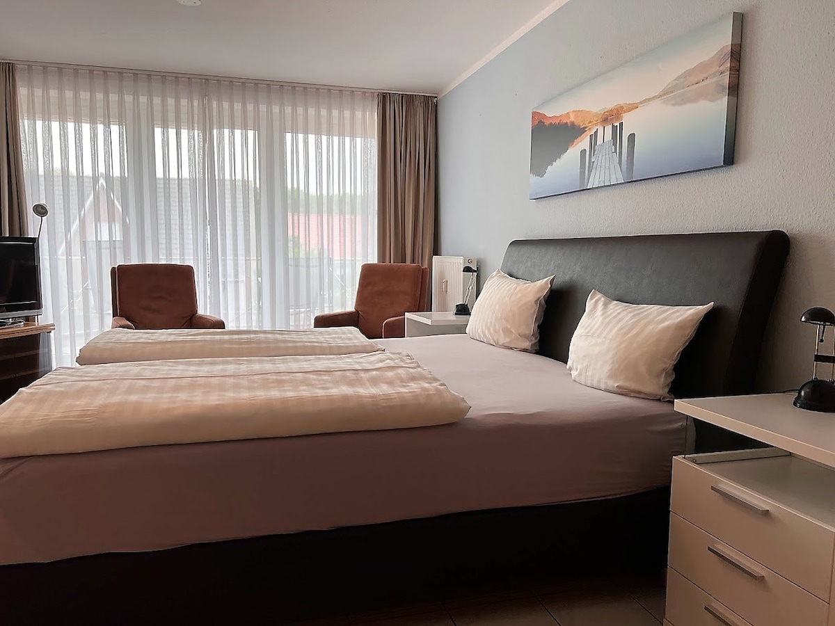 Nuestro luminoso apartamento de 1 habitación en la planta baja con balcón es perfecto para solteros. El dormitorio consta de una cama con somier, un pequeño armario empotrado y una acogedora sala de estar. La cocina americana está equipada con cafetera, tostadora y hervidor de agua, entre otros. Nuestros balcones están equipados con una pantalla de privacidad con el balcón vecino y se puede relajadamente. Puede traer a su perro.