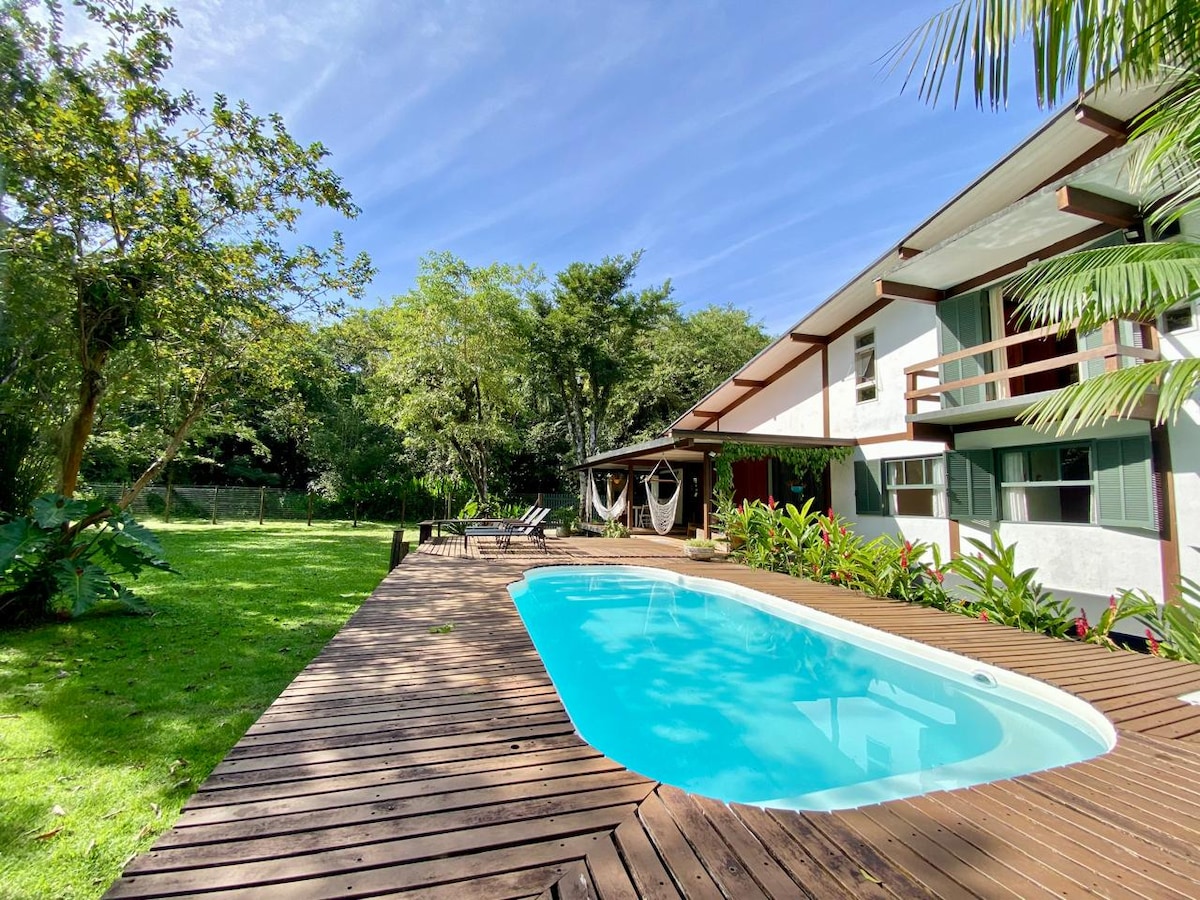 CONDOMINIO familiar con piscina en Paúba. Tenemos AIRE ACONDICIONADO en todas las habitaciones, una gran sala de estar, chimenea, cocina americana, un amplio balcón y 3 suites. Tenemos TV/Sky/Netflix, Wi-Fi con internet de fibra de 300 Mbps. Zona exterior trasera con vistas a la mata atlántica, espacio gourmet de 42 m² con parrilla, horno de pizza, mesa, nevera, además de un jacuzzi frío (hidromasaje desactivado) con sombrilla. La playa está a 200 metros de la casa y Maresias a 1 km (5 minutos en coche). Mercado y restaurante cercanos.