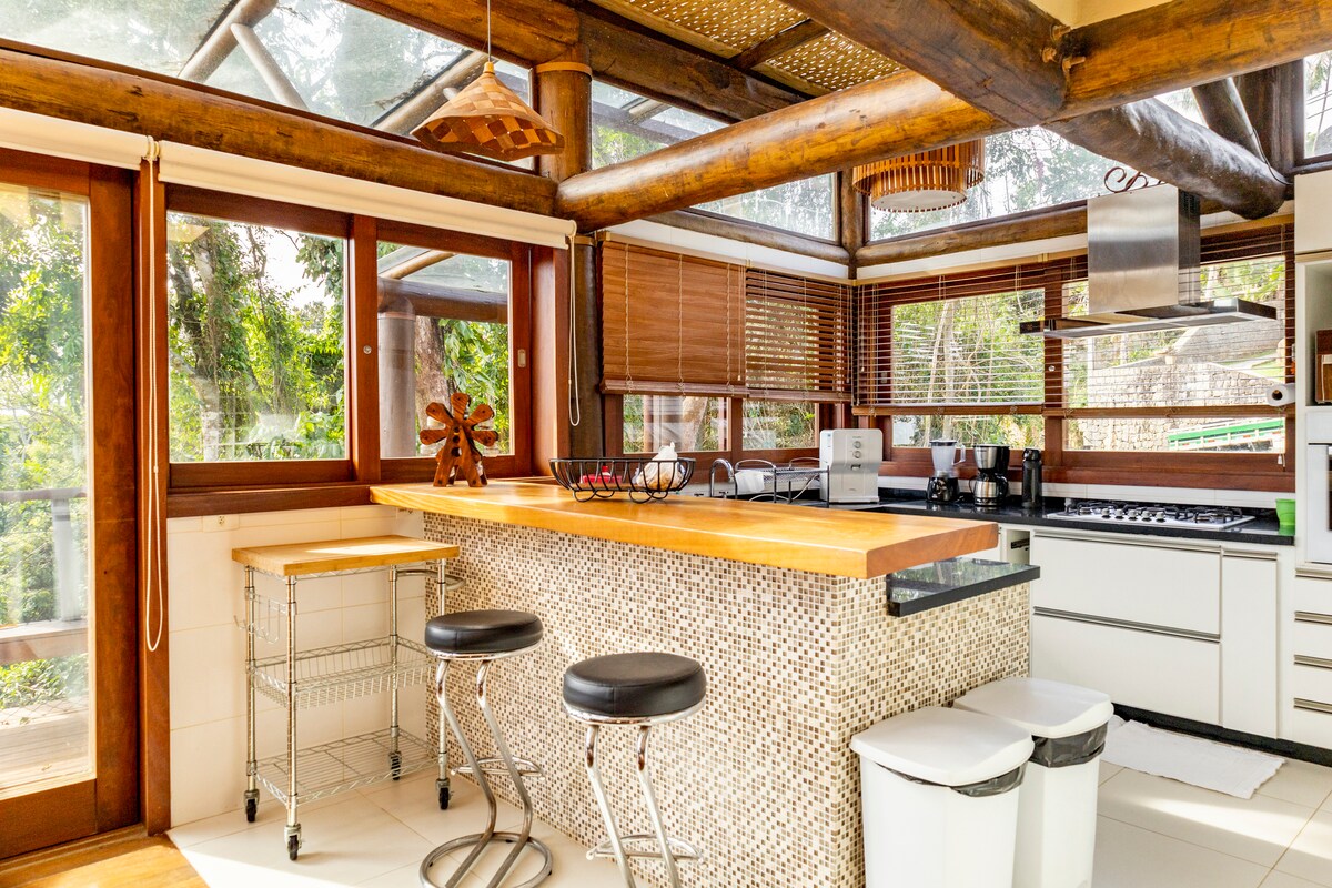 Casa con estilo y comodidad , suite de 5 estrellas (ducha de gas y bañera grande para dos con agua, aire acondicionado, ventilador de techo, colcha queen de calidad, sábanas de algodón de 400 hilos,TV, WiFi rápido: dos proveedores, balcón con red, vista al bosque atlántica y amplio armario. Para tu comodidad adicional: chimenea, cocina completa y quiosco-churrasqueira, piscina para dos sauna y río, todo privado. Jardín vallado para tu mascota. Condominio tranquilo, fácil acceso a las playas.