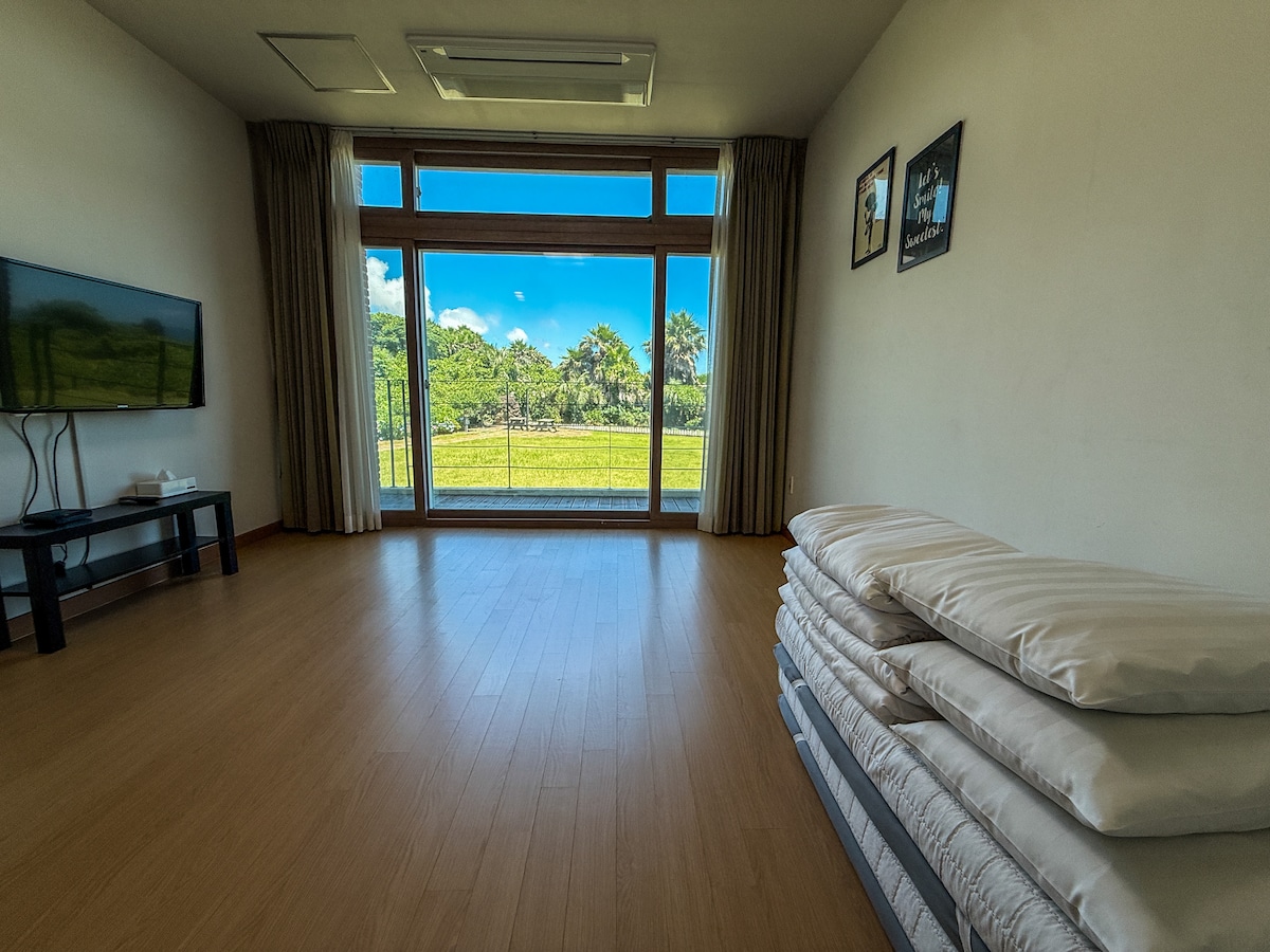 Se encuentra en el pueblo de Daepo-dong, justo al lado del complejo turístico Jungmun de Seogwipo. A 5 minutos a pie de la propiedad se encuentra el pueblo de Daepo-gu Hay un autobús urbano que va por las calles laterales de arriba y abajo Cuando utilice el autobús del aeropuerto, bájese en Daepo-gu. El alojamiento está ubicado en el segundo piso de una casa de dos pisos. El propietario vive en el primer piso. Entra en el alojamiento por las escaleras exteriores Detrás de la casa se puede ver el monte Halla. Hay campos de cítricos y casas alrededor de la propiedad. Es tranquilo porque está en el pueblo. La ventana es grande, por lo que es un ambiente brillante y fresco, y el interior es limpio.