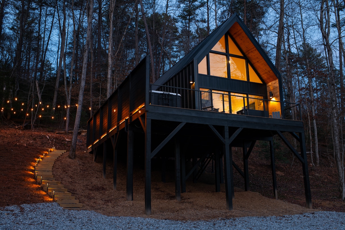 Bungalow con infusión de vidrio que invita a la naturaleza, ubicado en un bosque y a 10 minutos de Dahlonega. Camas tamaño QUEEN con colchón con la parte superior acolchada, ropa de cama de lujo. Techo de lengüeta y ranura con chimenea de pizarra, fogata, baño con ducha de pizarra, toallas de felpa. Electrodomésticos de cocina de acero inoxidable, vitrocerámica, horno, lavavajillas, microondas, horno tostador, nevera, utensilios, utensilios de cocina y Keurig. Nuestro patio al aire libre con parrilla te espera. Televisor de alta definición de 43 pulgadas ROKU equipado con Disney, Hulu, Max, Netflix, Paramount. Lic. de alojamiento para estancias cortas n.º4829