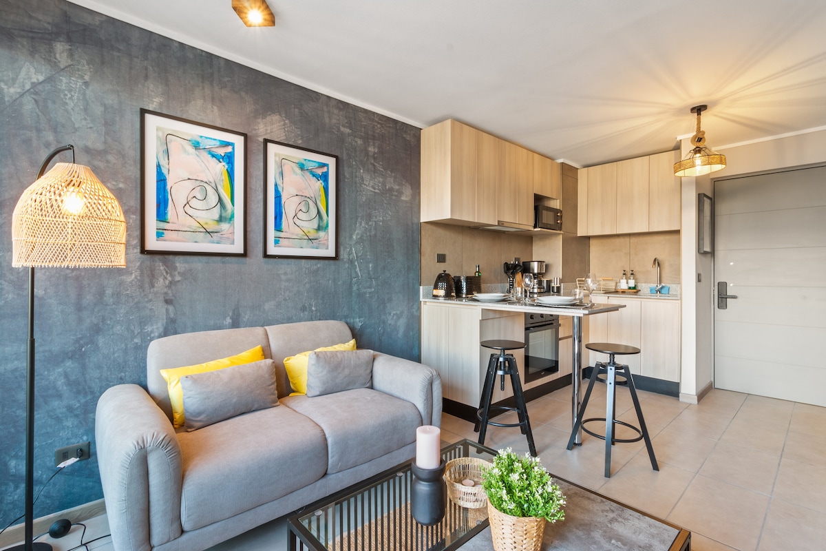 Ideal para estadías por trabajo, estudios o tratamientos de salud. Un espacio cómodo y funcional, perfecto para 2 personas. Departamento de 34 m² que dispone de 1 dormitorio con cama de dos plazas, cocina equipada con todo lo necesario para tu estadía (incluye lavadora–secadora). ✔ Cercano a Metro ✔ Wifi de alta velocidad ✔ Cocina equipada ✔ Edificio con piscina, gimnasio, área de coworking con wifi y conserjería 24/7 ✔ Ubicación estratégica, cercano a Clínica Bupa, mall y estación de metro