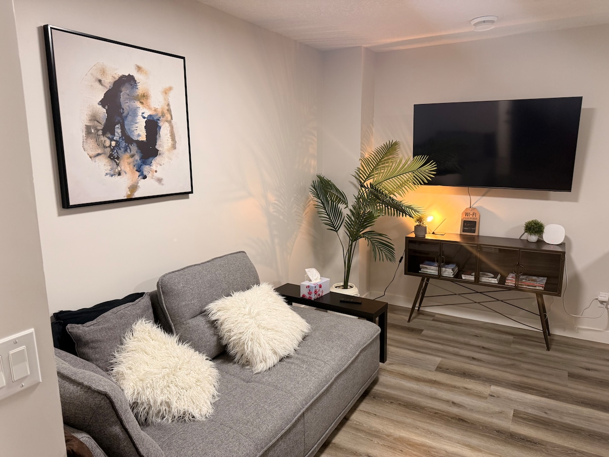Come and stay in our luxury two bedroom, 1 bathroom lower level retreat. You will be instantly greeted with a cozy living area and stylish decor. Cozy up to a modern crystal fireplace and a comfortable large reclining leather sectional, while you enjoy watching a 80” smart theater TV. We offer a side bar with coffee station, microwave and fridge and freezer. There are 2 large bedrooms and walk-in closet with plenty of storage. The king size tempur pedic bed is absolutely heavenly.
