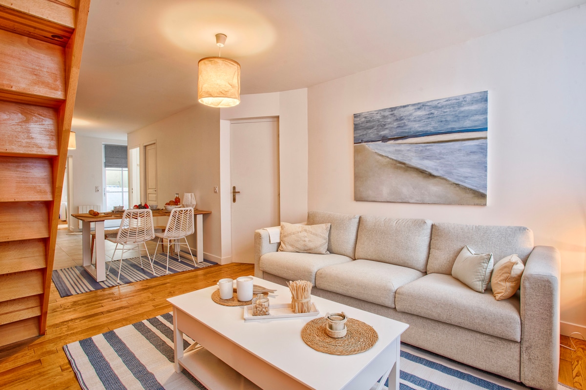 Located on the beach and 5mn walk from city center, our house can accommodate up to 8 people (*) Enjoy the beach and the terrasse (fully equiped) Ground floor: one large room with living room and kitchen 1st floor: 2 bedrooms (queen size), bathroom and WC. 2nd floor: 2 up to 4 single beds. Basement is independant, with washing machine and dryer. You can store your beach material Private parking for one car IMPORTANT: bed linen and towels optional (10€/pers)