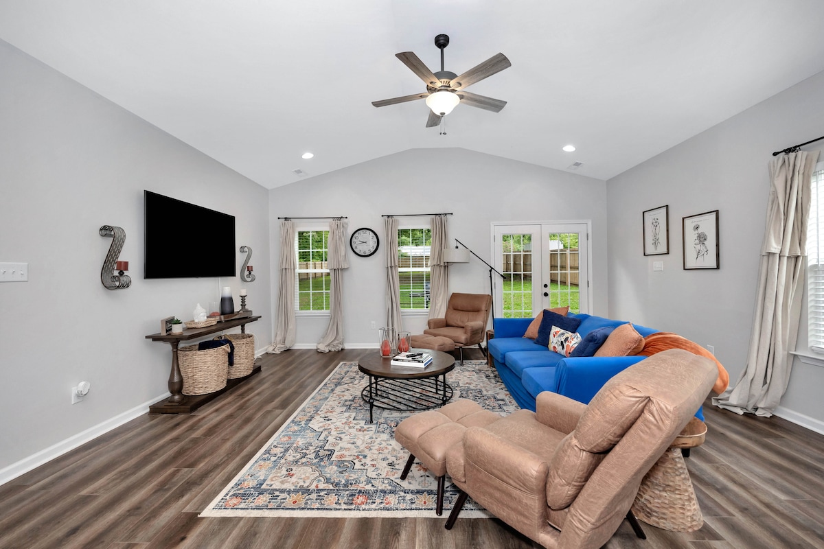 Graceful-Stays welcomes you to our Spacious & Family-Friendly 5BR, 3BA retreat in Decatur, Alabama! Enjoy a game room with pool, outdoor ping-pong, and skee-ball, 574 Mbps Wi-Fi, a cozy fire pit, and a fully equipped kitchen. Comfortably sleeps 10. Located near Delano Park, the Cook Museum & more — perfect for families, group getaways, and pet lovers. With smart lock entry, free parking, and an EV charger, your Southern-style escape awaits!