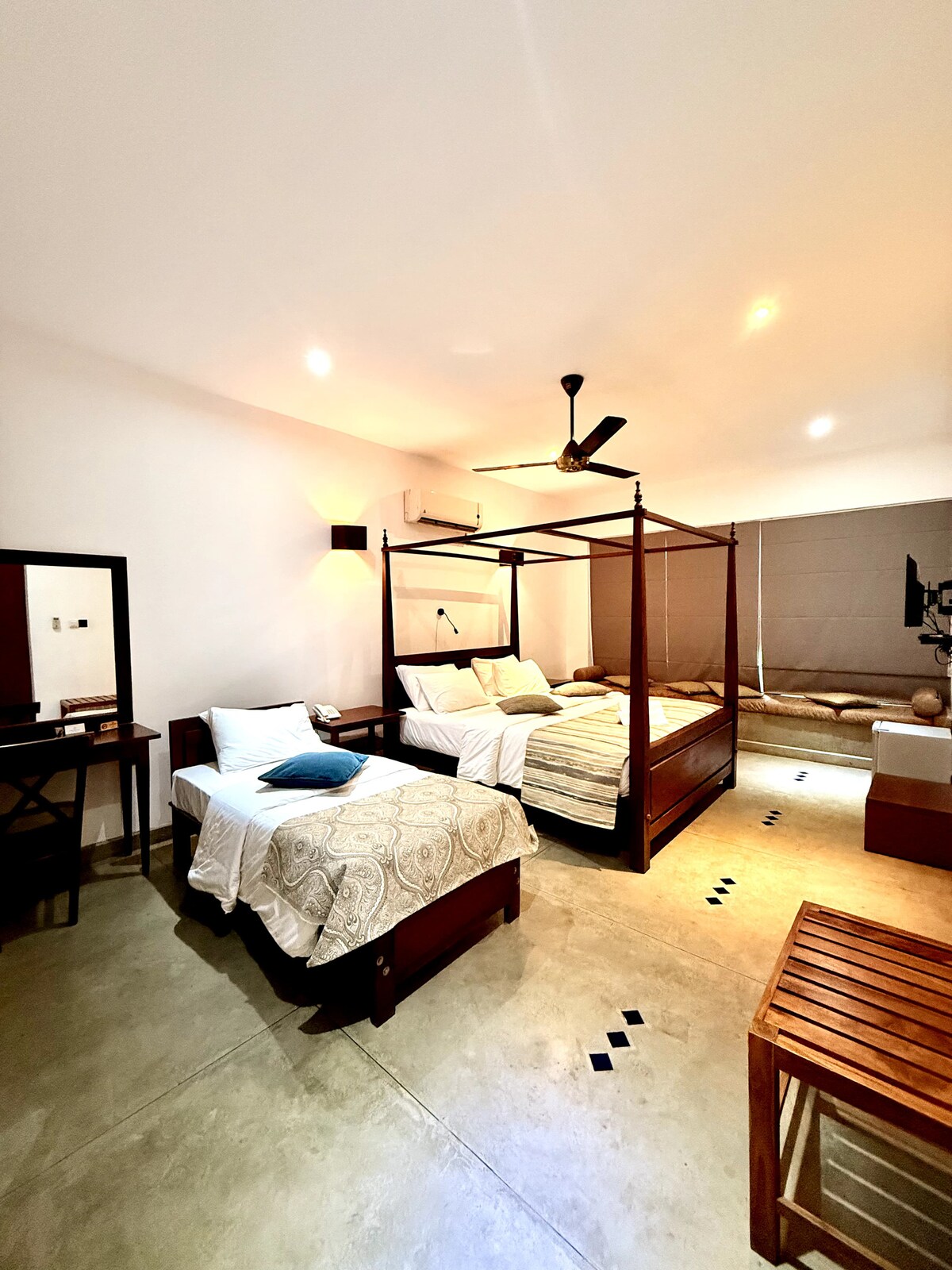 This spacious suite features accomodates 4 guests with an attached kitchen, washer, and a bathroom with bathtub, ideal for guests seeking an apartment-style stay within Coza Ceylon, our hotel in Colombo, Sri Lanka. Guests enjoy full hotel services including housekeeping and access to our pool, while benefiting from the privacy of their own quarters separate from our standard, fast-paced hotel rooms. Perfect for longer stays with the comforts of home and the services of a hotel.