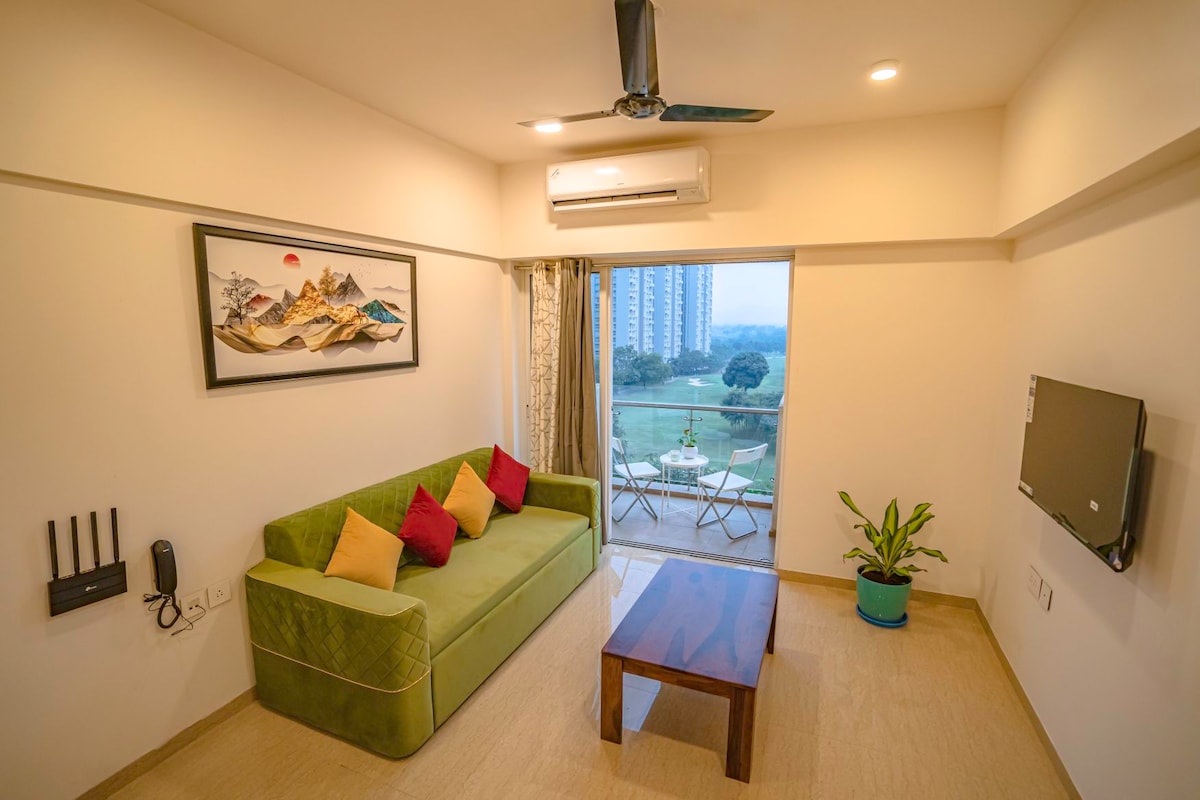 Relájate en este tranquilo refugio de 1BHK con un acogedor balcón con vistas al exuberante campo de golf. Disfruta de un televisor LED de 65", wifi rápido y unos interiores relajantes y artísticos que combinan la comodidad con un diseño lleno de alma. Tanto si sois una pareja, viajas en solitario, trabajas a distancia o sois una familia pequeña, este espacio cuidadosamente seleccionado ofrece todo lo que necesitáis para relajaros, trabajar o explorar. Ubicado a solo 30 minutos de Pune, es perfecto para escapadas de fin de semana, estancias conscientes y escapadas tranquilas más largas.