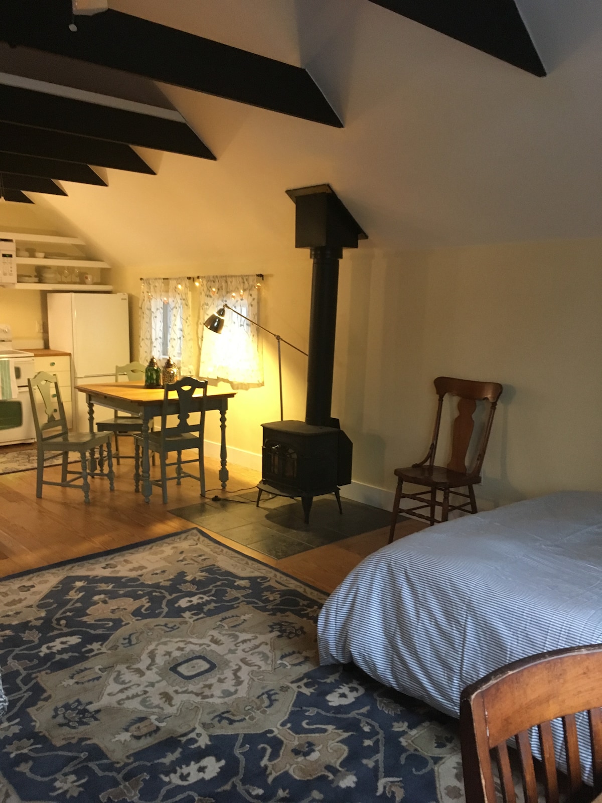 Romantic waterfront loft for couples in a charming barn. Relax in a cozy king bed, enjoy a full bath, and prepare meals in the well-equipped country kitchen. Sip wine or morning coffee on your private balcony overlooking the water, or explore the creek together with kayaks and paddleboards. Share the pool (April-October), lawn games, and game room with one other rental unit. Perfect for a peaceful getaway to unwind, reconnect, and savor quiet moments together.
