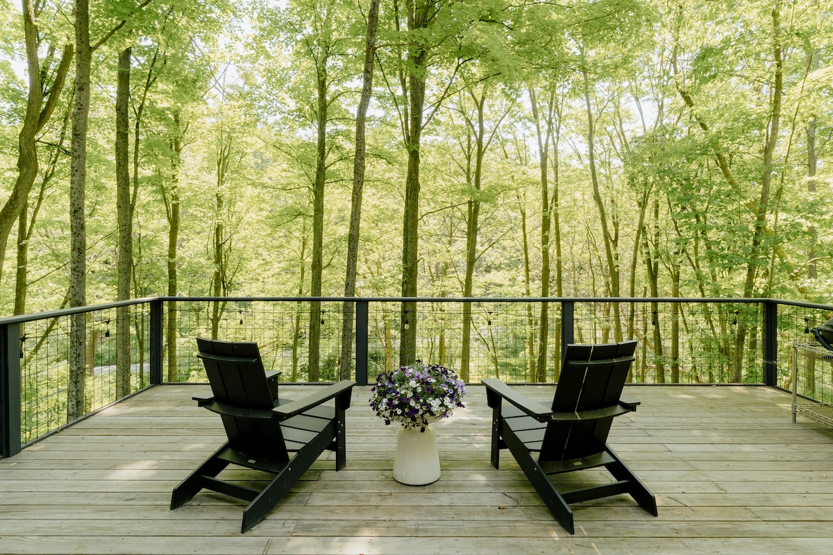 Moderna casa triangular con fachada de cristal en las Catskills, con vistas panorámicas a la montaña. Relájate en la sauna privada de barril de cedro y en la refrescante ducha al aire libre, reúnete alrededor de la mesa de fuego de propano sin humo o enciende la parrilla de propano para cenas al aire libre. Un dormitorio elegante con vistas al bosque, sábanas de lujo, wifi rápido y una acogedora chimenea eléctrica combinan comodidad y diseño. A minutos de senderos, cascadas y mercados de agricultores, ideal para parejas que buscan una escapada serena y reparadora.