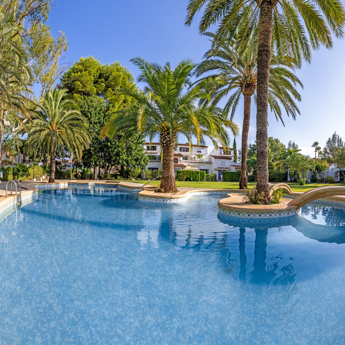 Bienvenidos a nuestro pequeño adosado a solo 5 minutos de la playa en coche y a 15 minutos del centro a pie. Disfruta de una piscina y un jardín preciosos con vistas al Montgó. El adosado, que acaba de ser reformado al completo, está en una urbanización muy tranquila y cuenta con lavavajillas, cocina, lavadora, aire acondicionado y fibra simétrica de 600mb, lo que lo hace perfecto para una escapada en pareja o para teletrabajar. Es la base perfecta para tus aventuras en el Mediterráneo.
