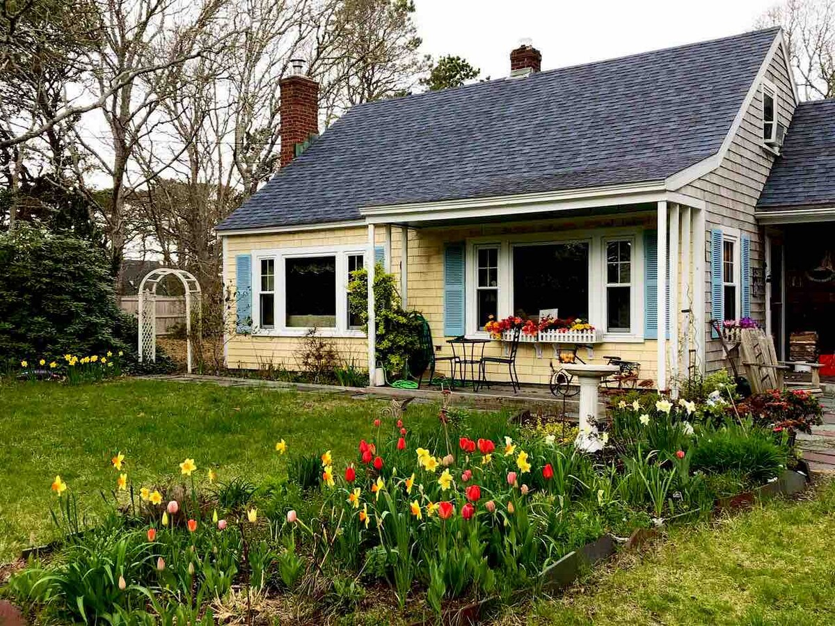 ¡Gloriosos jardines y brisas de la bahía! Cama tamaño king Casper en una romántica y antigua casa de campo estudio de Cape Cod con entrada y patio privados, bañera con patas dobles en la habitación, artículos de baño de lujo y sábanas Brooklinen. ¡Recién reformada de arriba abajo! Suelos de mármol y madera antigua, decorados con una colección rotatoria de antigüedades, arte local original y mucha luz. Ubicada a lo largo de la histórica ruta 6A (Main Street), cerca de otras galerías, museos, senderos para caminar, estanques y playas; a 90 segundos de la playa más cercana.