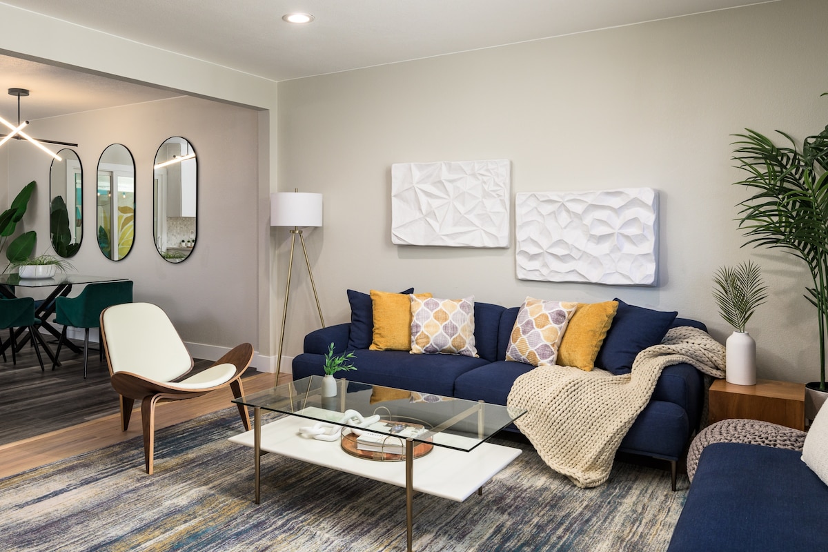 ¡ColorPop BNB cuenta con 2600 pies cuadrados de espacio moderno y acogedor, 6 dormitorios/3 baños y una cocina luminosa equipada con productos esenciales! Relájate en el patio cubierto digno de Instagram bajo las luces de cuerda después de un día explorando. Relájate y disfruta de tus películas favoritas en la pantalla de cine 4K de 100 pulgadas. Desafía a tus mejores amigos a jugar al billar en la sala de juegos del garaje convertido: ¡el ganador podrá elegir su cama primero! Consejo profesional: los favoritos están en el escondite de la habitación de los niños (gran armario de Harry Potter), ¡pero pueden dormir dos adultos de hasta 5'10"!