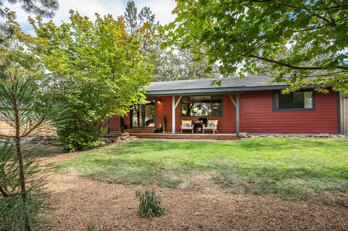 Escape to this peaceful, private home nestled amongst the Ponderosa pine trees and lava rock. The modern rustic home boasts heigh ceilings and a spacious open floor plan with solid oak floors throughout. The kitchen flows into an expansive dining and living area where you can soak in the views of the lava flow, towering pine trees, and visiting deer through the soaring wood framed windows. Enjoy the spacious private backyard while relaxing in the hot tub, sitting around the fire pit, or BBQing.