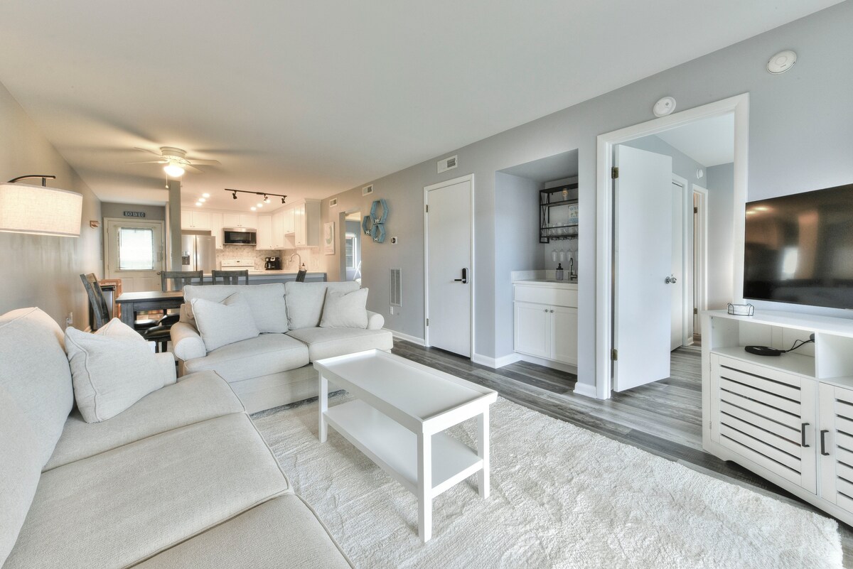 Apartamento de playa recién reformado y decorado por un diseñador con 2 dormitorios y 2 baños con las camas más cómodas que puedas imaginar. Situado en el corazón de Dewey Beach con piscina al aire libre y a solo 1 manzana de la playa y la bahía. Un dormitorio incluye una cama tamaño king con baño privado. El segundo dormitorio incluye una cama tamaño queen y dos camas individuales adyacentes al segundo baño. La cocina totalmente equipada cuenta con electrodomésticos de acero inoxidable, encimeras de granito, una isla con asientos y lavadora/secadora. Incluye 2 plazas de aparcamiento.