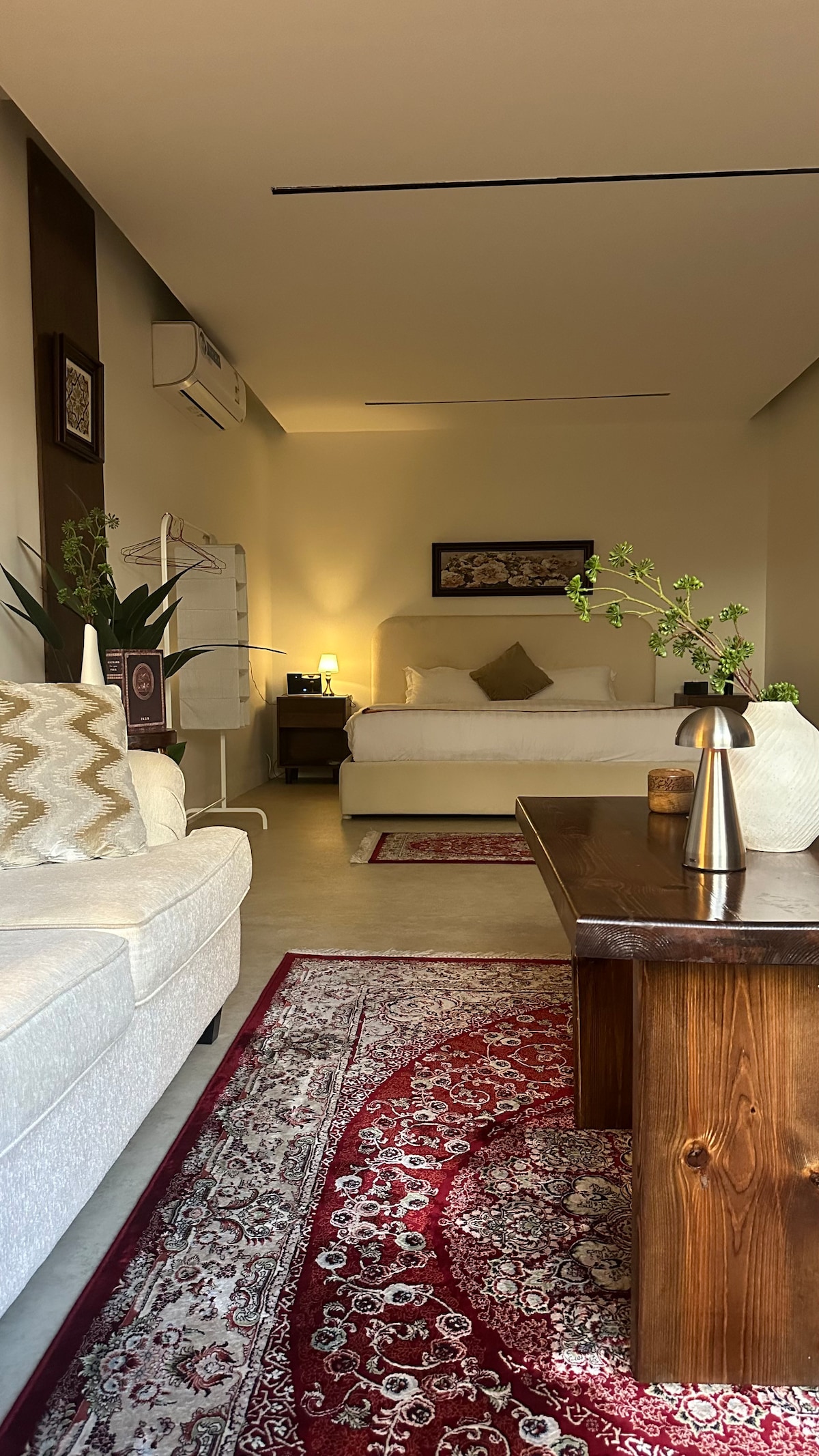 Apartamento de hotel de un dormitorio con sala de estar y balcón con zona de café exclusiva Escápate a este acogedor refugio de un dormitorio diseñado para la comodidad y la elegancia. Ideal para viajeros solteros o parejas, ya que combina la comodidad moderna con un toque de lujo: Cómodo dormitorio con una cama tamaño queen con sábanas suaves y lujosas. Un salón luminoso con un cómodo sofá, una televisión inteligente y una decoración elegante. Balcón privado ideal para tomar el café de la mañana o disfrutar de la puesta de sol. Internet de alta velocidad y un ambiente tranquilo para relajarse o trabajar.