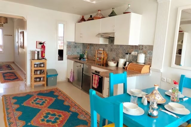 Esta joya, realizada con gusto y atención a los detalles, se encuentra en el interior del Residence Mogador Beach, justo enfrente de la playa de Esauira. Residencia con piscina comunitaria, aparcamiento y vigilancia 24/7. El apartamento tiene un gran dormitorio doble, con vistas espectaculares al mar, 2 baños, un gran salón con cocina equipada, un sofá que se puede convertir en la segunda cama con capacidad para 2 personas. Wifi de fibra. Hermosas vistas al mar. Gestión profesional
