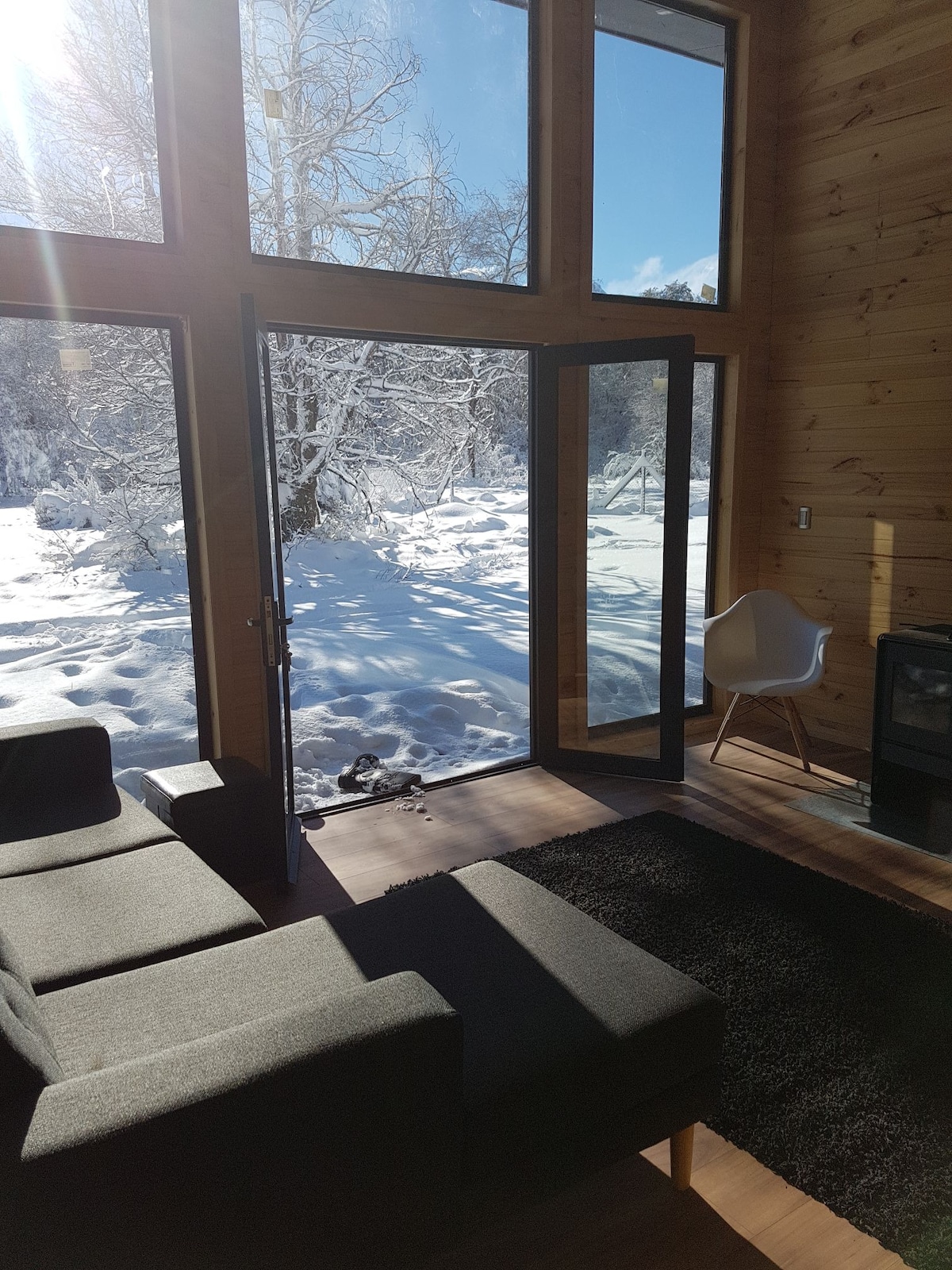 Cabaña Nordica en madera con grandes ventanales orientados al sol y la montaña. Lugar 2 habitaciones matrimoniales. 1 habitacion 1 cama y 1 camarote. Baños 1 baño completo 1/2 baño comun sin ducha Configuracion: 2 familias (4 adultos + 3~4 niños) 2 parejas + 2 invitados 2 habitaciones cama europea (150cm) + 1 habitacion (1 cama europea (90m) y 1 camarote (80cm×190cm) 5 adultos