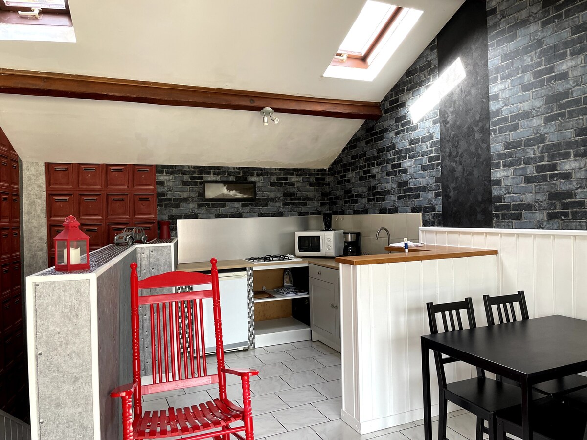 Apartamento estilo taller de artista. Hermoso espacio, gran sala de estar de estilo escandinavo, cocina totalmente equipada, ubicación muy discreta con cama plegable tamaño king. Un baño con ducha, WC separado con lavabo. - La parte de dormir en el altillo, a través de una escalera calada tipo molinero, le da acceso a la habitación principal con cama king size, pequeño escritorio, armario, mesita de noche y mesa de centro. - Dormitorio 2, con camas nido 2 x 90x190, un armario; un espacio de inodoro con lavabo.