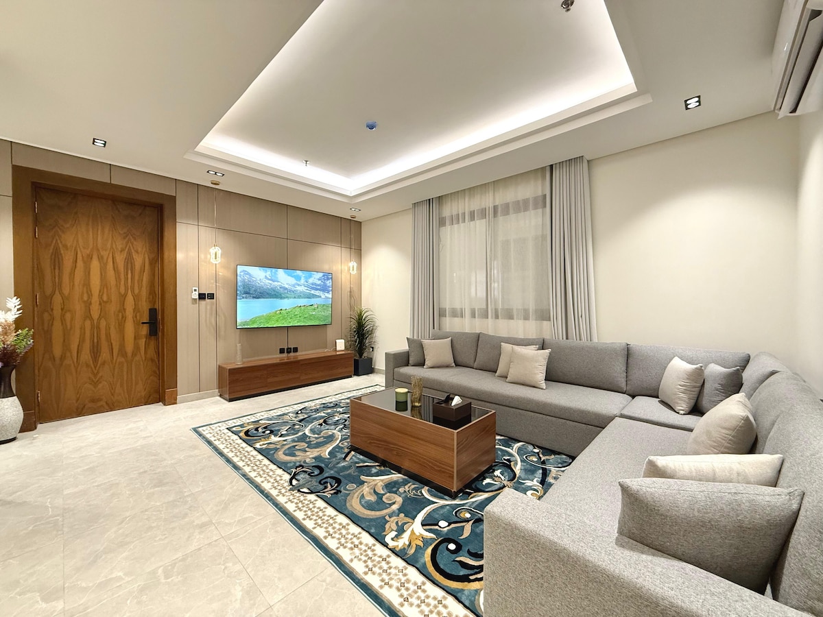 Lujoso apartamento ubicado en un impresionante complejo en un vecindario prestigioso. Disfruta de impresionantes vistas del jardín desde tu ventana, cocina totalmente equipada, cafetera y un televisor inteligente de 75pulgadas. Ubicación ideal cerca de las principales atracciones turísticas y lugares de entretenimiento, como Diriyah, Boulevard City, Boulevard World y más. La pista de atletismo está a solo 2 minutos en coche, mientras que el exclusivo Thagher Complex también está a solo 2 minutos y ofrece una amplia selección de restaurantes, cafeterías y tiendas.