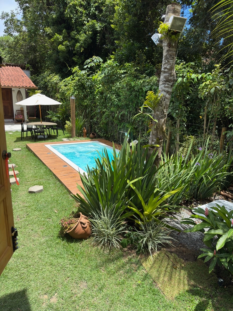 Chalet en el centro de Arraial d'Ajuda muy bien ubicado cerca de la Rua do Mucuge, donde se encuentran los mejores restaurantes y bares. La cabaña cuenta con aire acondicionado, TV por cable, wifi y una mini cocina y jardín privado. Junto a la casa se encuentra el Paiol, cafetería tradicional en Arraial d'Ajuda donde todo se hace a mano, panes, croissants, pasteles, etc. Fácil acceso a la playa y a otros paseos como Trancoso, Espelho, Caraiva.