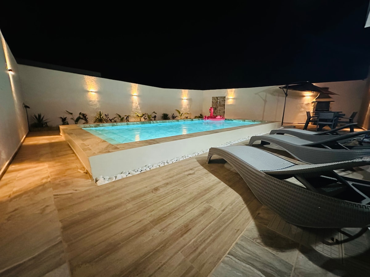 Bienvenido a nuestra villa sin vecinos orientada al sur, en una zona tranquila Cuenta con una gran piscina privada, una piscina infantil, una gran sala de estar, una cocina equipada, una zona de pérgola para relajarse, una barbacoa, una zona acogedora... Hay juegos de mesa disponibles para entretenerse A 200 m de la mezquita, y en coche: a 2 min del supermercado, a 5 min de la playa y a 15 min del centro de la ciudad de Midoun y del centro comercial Bourgo Mall El coche es muy aconsejable