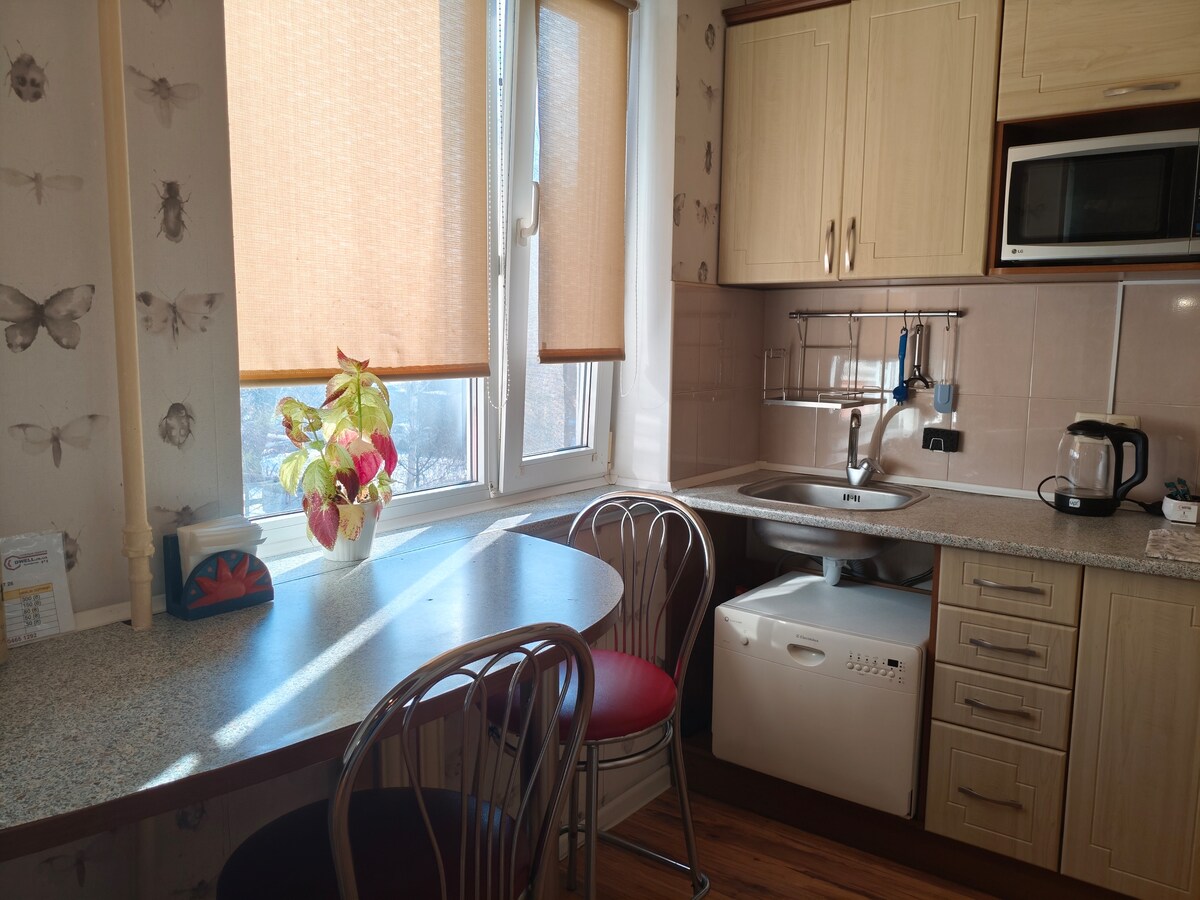 Apartamentos acogedores y tranquilos a 15 minutos del centro de la ciudad, ubicados en la dirección: avenida Polya, 84a. A poca distancia se encuentran el parque Zelenyi Hai y el parque B. Khmelnytskyi, el centro comercial Slavutych, el centro comercial Apollo, supermercados, tiendas, cafeterías y restaurantes.