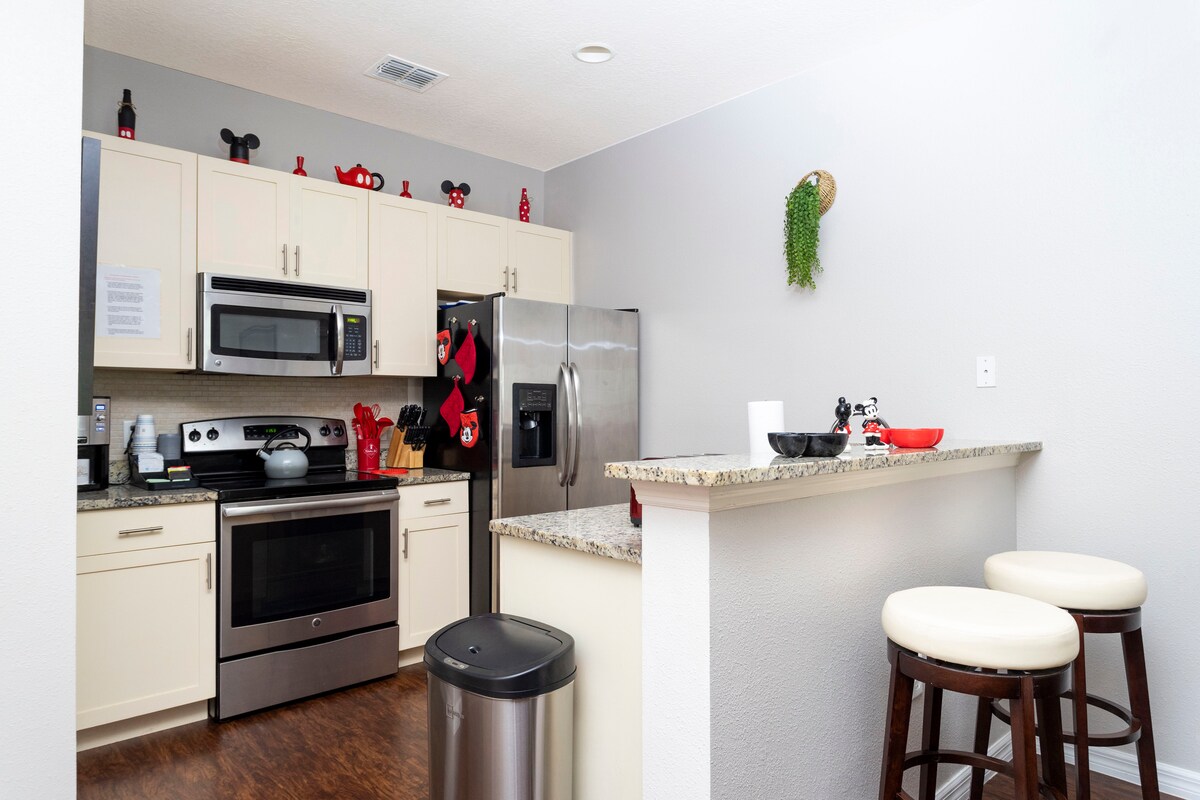 ¡Escápate a este hermoso condominio, perfectamente ubicado cerca de los parques de Disney! Una gran sala de estar, una cocina completa y comedor, está diseñada para la relajación y la comodidad. Dos dormitorios incluyen una habitación con temática de Mickey con una cama tamaño queen y 2 literas, la otra habitación con baño completo tamaño king y dos baños completos. Disfruta de un patio cubierto para disfrutar de un tiempo de calidad con familiares y amigos. Lo mejor de todo es que tendrás acceso gratuito a dos fantásticos parques acuáticos comunitarios con restaurantes y bares en el lugar. ¡Tus vacaciones perfectas te esperan!