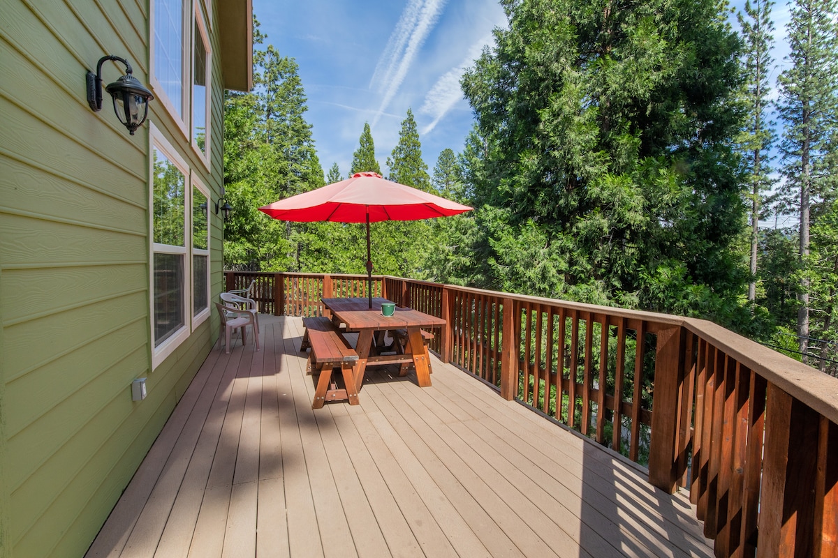 Enjoy an escape to crisp, clean mountain air and a relaxed lifestyle: Mountain Time. Curl up in front of the warm and welcoming fireplace, enjoy cocktails on the large deck, and take advantage of never ending outdoor activities. This three-bedroom, two bath mountain sanctuary is located just above the Stanislaus River in the Sierra Nevada Mountains. Elevation 5,000 feet. The cabin is a short walk from the Old Strawberry bridge and several forest trails.
