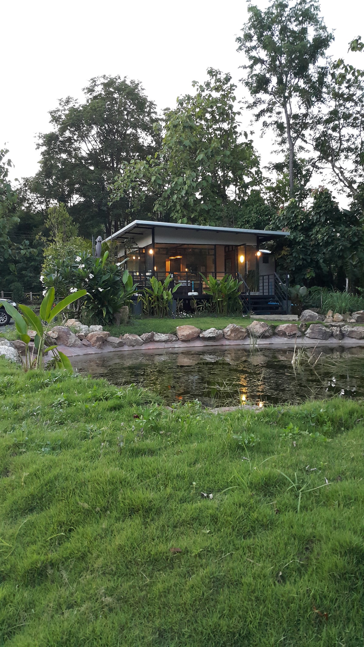 Encantador refugio enclavado en el corazón de las serenas montañas de Chiang Mai. Relájate en la tranquilidad de la naturaleza mientras descubres la combinación perfecta de comodidad y aislamiento. Situado junto a un suave arroyo, nuestro encantador alojamiento ofrece una melodía relajante de la sinfonía de la naturaleza. El ambiente se ve reforzado por un extenso estanque en frente, que ofrece una vista pintoresca que agrega un toque de magia a tu estancia. Imagina despertarte con el sonido del canto de los pájaros y el suave susurro de hojas que te rodea.