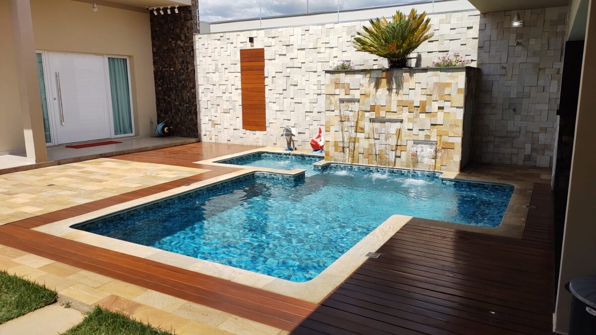 Casa con piscina, barbacoa interior y exterior, 2 baños (1 exterior), dormitorio 1 con cama doble y cama individual, dormitorio 2 con cama individual y cama doble, ventiladores de techo en los dormitorios, microondas, nevera, cocina, TV LED, utensilios domésticos, garaje para 3 coches, Internet Wi-Fi, excelente ubicación en una zona residencial de lujo. Acepto mascotas pequeñas con un gran patio ideal para momentos en familia