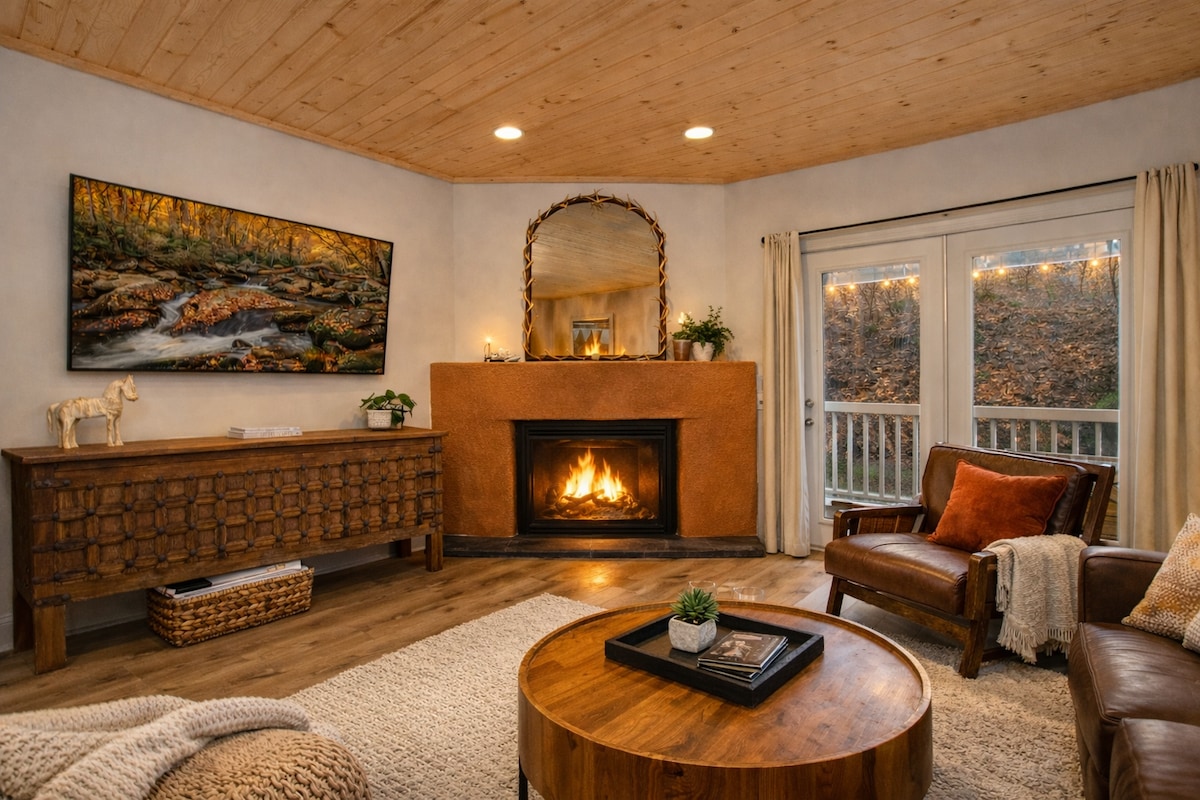 Situada en el corazón de las Montañas Humeantes, nuestra cabaña cuenta con un entorno aislado, rodeada de exuberantes bosques verdes, árboles imponentes y vistas panorámicas a la montaña. Con una bañera de hidromasaje, juegos y sala de teatro, ¡siempre tendrás algo que hacer! Al entrar, te recibirá un ambiente cálido y acogedor. La sala de estar está adornada con lujosos sofás y una chimenea de piedra para las noches que se pasan acurrucados con un libro o disfrutando de animadas conversaciones con los seres queridos.