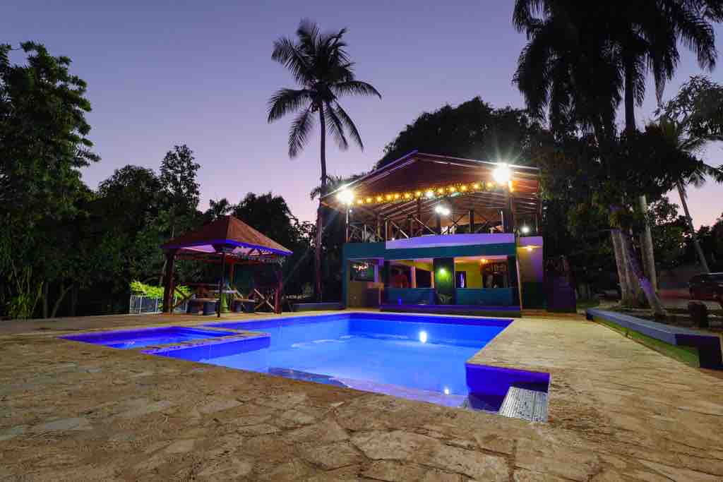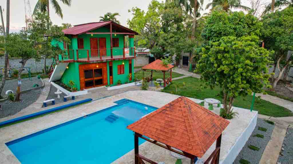 Cabaña rustica de 2 niveles en Lodge tropical, construccion tradicional dominicana (madera y cana).4 habitaciones (camas queen). 3 baños. Capacidad: 8 personas (o 10 personas con camas supletorias twin por 20$/noche por cama). Cocina totalmente equipada. Salon. Limpieza diaria. Ventiladores. Mosquiteros.Agua caliente. TV con Netflix. Lodge tiene PISCINA, bar/cafeteria, zona de barbacoa, y parking. Se ofrece desayuno, almuerzo y cena por un cargo adicional. Tours locales.