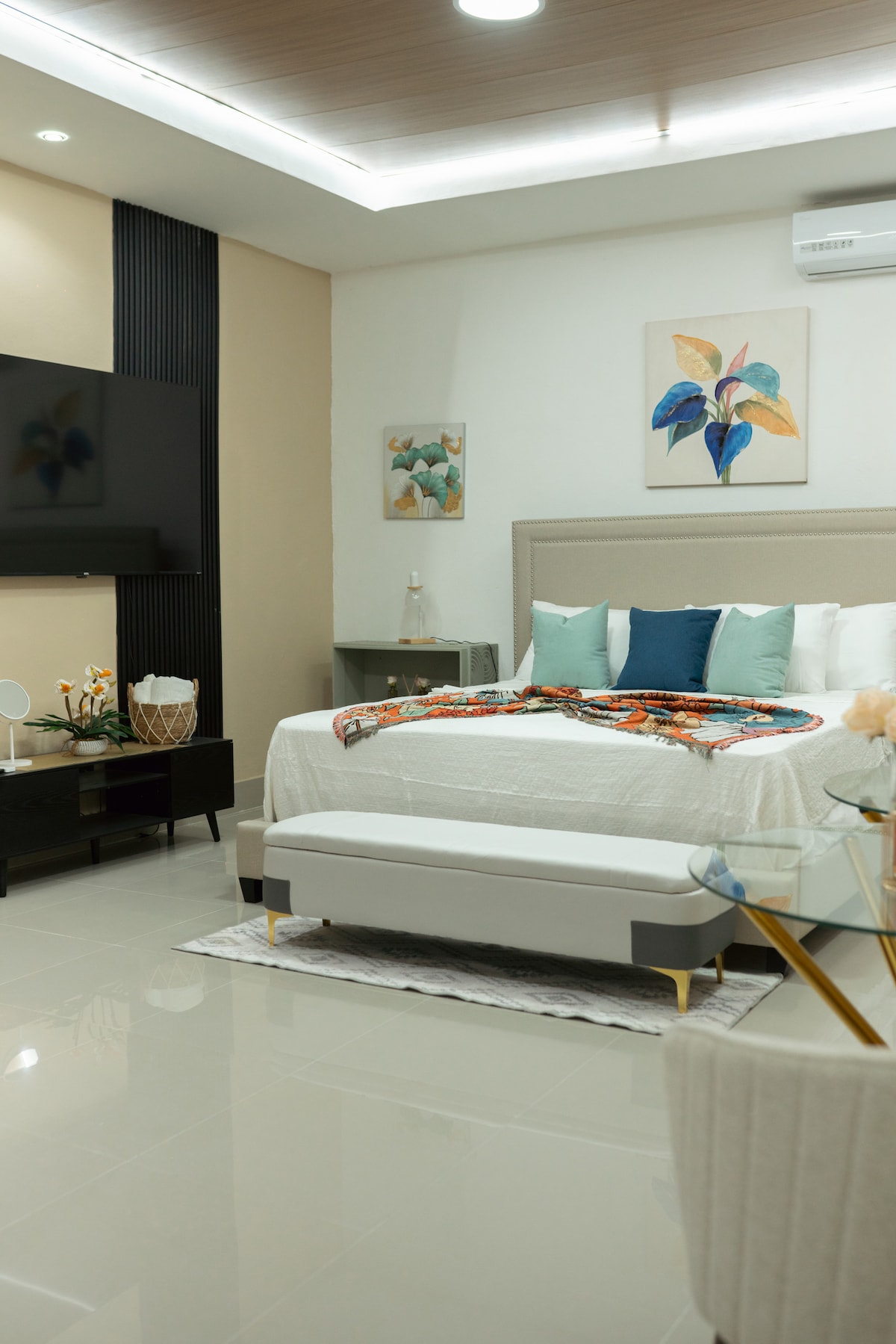 Este cuarto acogedor de estilo colonial cuenta con una cama matrimonial cómoda y una decoración minimalista en tonos cálidos con detalles en azul. Incluye un baño privado compacto, equipado con agua caliente, un elegante espejo redondo y una ducha práctica. El espacio también ofrece aire acondicionado. Ideal para quienes buscan comodidad y funcionalidad mientras exploran la ciudad.