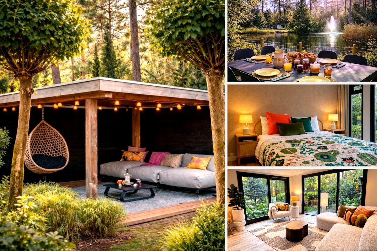 Escape to our peaceful, dog-friendly forest home with serene lake views from a stylish veranda. This detached retreat comfortably fits 4–5 guests, perfect for relaxing couples and families. Enjoy a private, spacious, fully fenced garden—ideal for kids and dogs—plus direct access to nature trails, sand dunes, and park amenities like a pool and an on-site restaurant. A cozy, stylish getaway with comfy beds, a fully equipped kitchen, fast WiFi, and A/C. Perfect for walking and cycling.