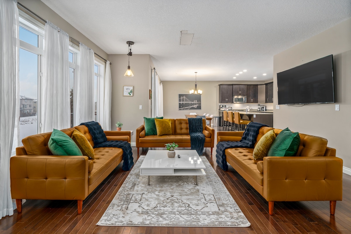 Casa completa contemporánea con 3500 PIES CUADRADOS de espacio habitable ubicado en una zona residencial segura y tranquila cerca del aeropuerto y Taralake. Total 7 dormitorios de gran tamaño, 9 camas y 4 baños completos que pueden permitir que se queden más de 16 personas. WIFI 5G, dos cocinas completas, tres salas de estar con televisores, dos juegos de lavandería. Ideal para familias grandes y grupos. Autobús, tren C cerca, y también restaurantes y bares. A 5 minutos en coche del aeropuerto, a 8 minutos a pie de C-Train, autobuses y restaurantes, bares y tiendas de comestibles. El gran YMCA está a 5 minutos a pie.