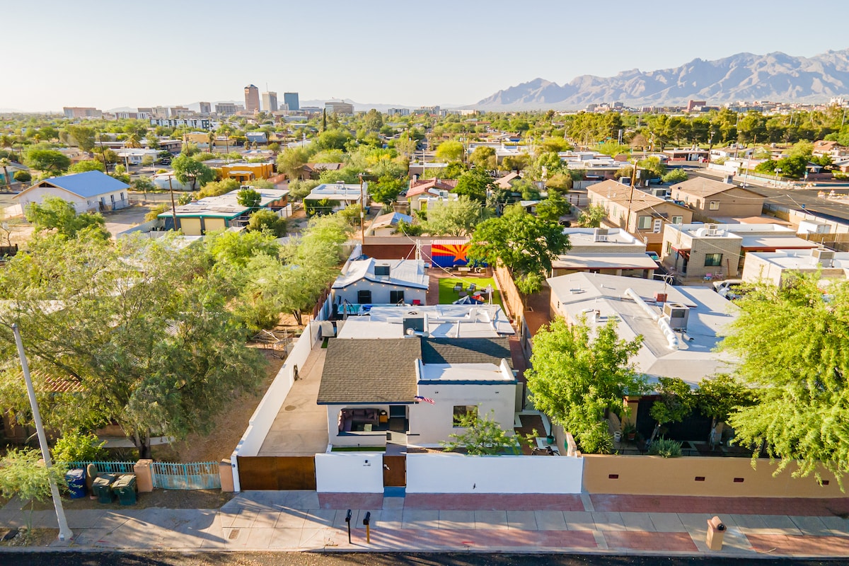 ¡Casa en el segundo piso de 2 BR, 1BA en el barrio histórico de West University! A poca distancia a pie del centro de la ciudad, el campus de la UA, la plaza principal de la puerta y la histórica Cuarta Avenida (+ tranvía gratuito muy cerca). Camas tamaño queen de lujo, ducha grande, cocina bien surtida y un lugar de garaje designado te esperan. El patio, la piscina (sin calefacción) y el jacuzzi son privados para tu estadía. La piscina no está vallada, por lo que es inadecuada para niños pequeños (menores de 12 años) y mascotas. Es posible que la escalera de caracol no se adapte a las personas con problemas de movilidad. Wifi súper rápido.