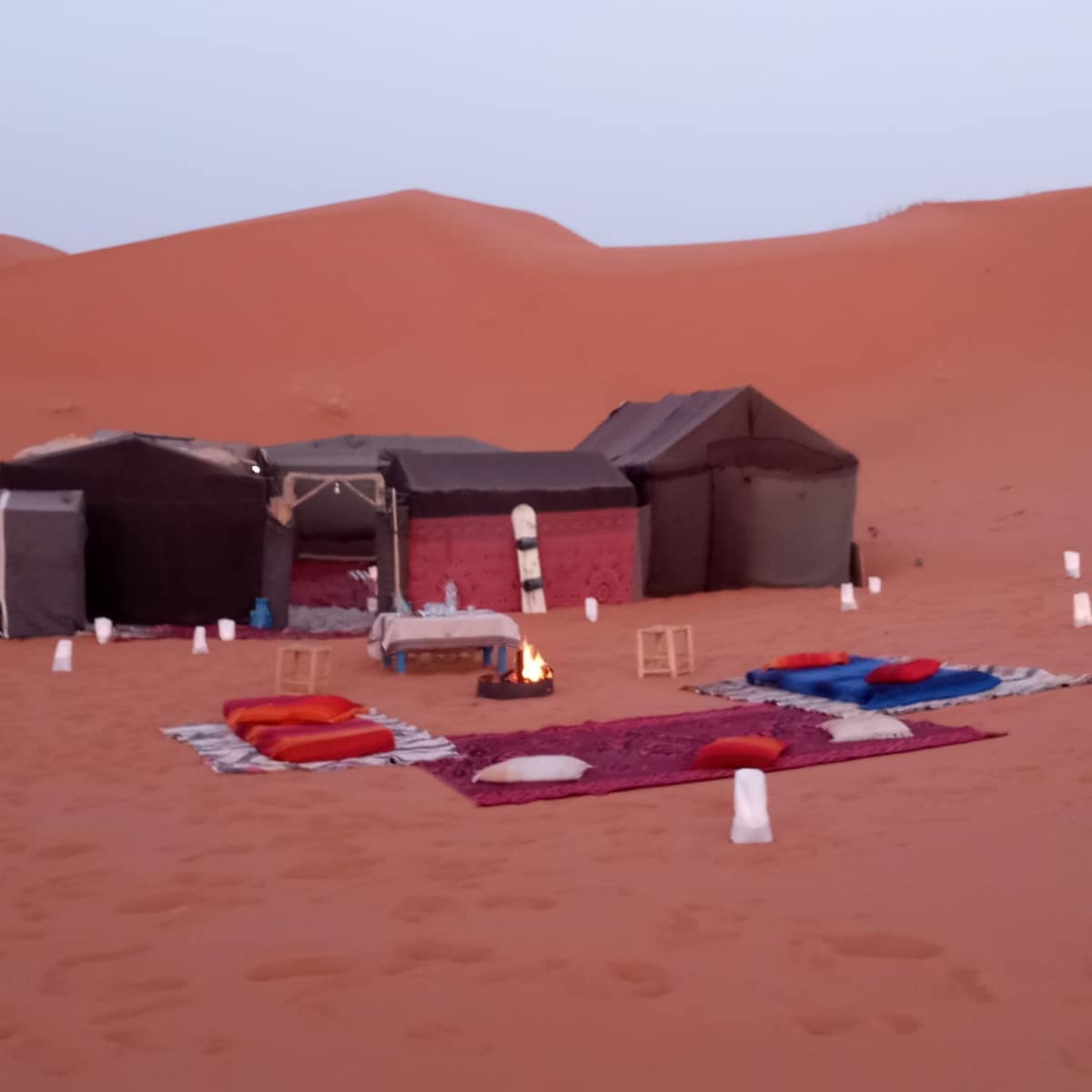 Volver a lo básico: vive la vida nómada Experimenta el verdadero estilo de vida nómada en nuestro campamento base en el desierto. Como anfitriones bereberes locales, compartiremos nuestras tradiciones y nuestra forma de vida. Disfruta de un desayuno tradicional bereber y podemos organizar el almuerzo o la cena bajo petición. Después de la puesta de sol, reúnete alrededor de la fogata para disfrutar de música en vivo bajo las estrellas. ¿Quieres montar en camello, hacer sandboard o quad? Solo tienes que decírnoslo y lo haremos realidad. ¡Esperamos recibirte!