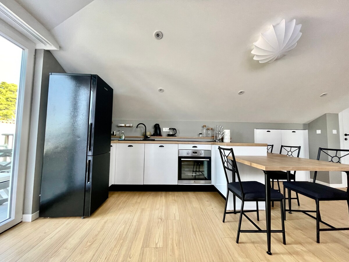 El apartamento está situado en el ático sobre el paseo marítimo, no muy lejos del centro de la ciudad. Cuenta con un gran salón, conectado al comedor y una cocina (con lavavajillas, microondas, nevera, horno y fogones). También cuenta con 2 dormitorios, un amplio balcón amueblado, TV de pantalla plana con canales vía satélite, 1,5 baños equipados con lavadora, ducha y secador de pelo. El establecimiento ofrece toallas y ropa de cama. Dentro del apartamento hay aparcamiento privado gratuito.