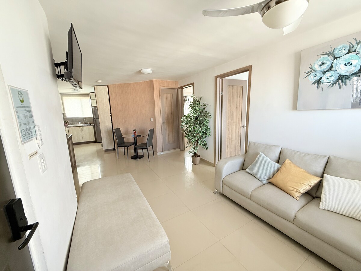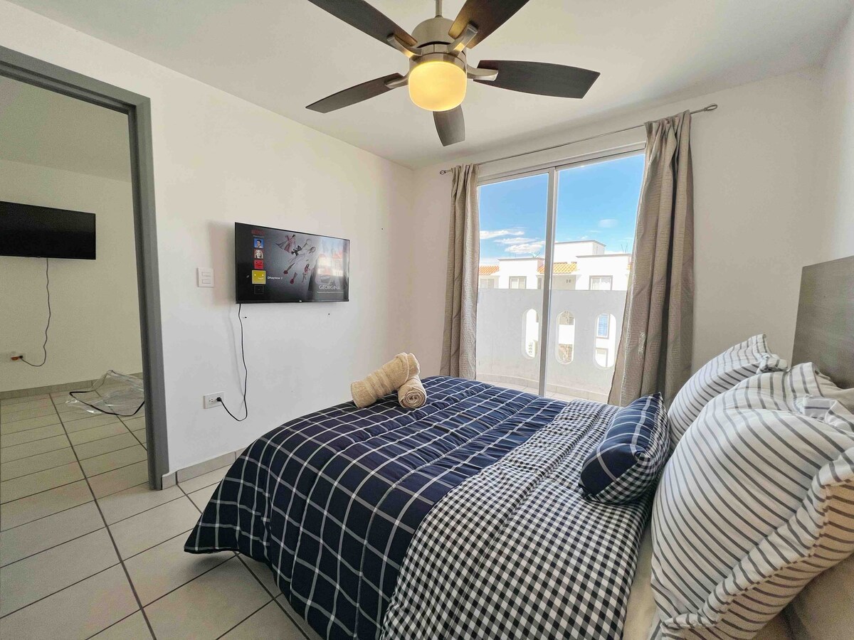 Hermoso condominio con dos habitaciones completas y cuarto de televisión. Estacionamiento gratuito y seguro. Vigilancia 24/7. A 10 minutos del centro de la ciudad.