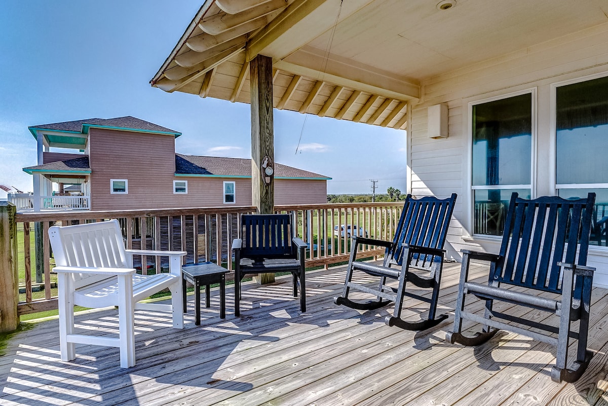 ¡Despiértate todas las mañanas de tus vacaciones con tu propia vista en primera fila e ininterrumpida del Golfo! Nada se interpone entre tú y la costa de arena de Crystal Beach, Texas, cuando te hospedas en esta pintoresca casa con una piscina climatizada / fría, un jacuzzi y el horizonte panorámico. El lujo costero y la relajación sensorial total te esperan a ti y a tu familia, desde el olor salado y el sonido relajante de la brisa del mar, hasta tomar tu café mientras observas a los delfines mientras el sol sale sobre el agua.