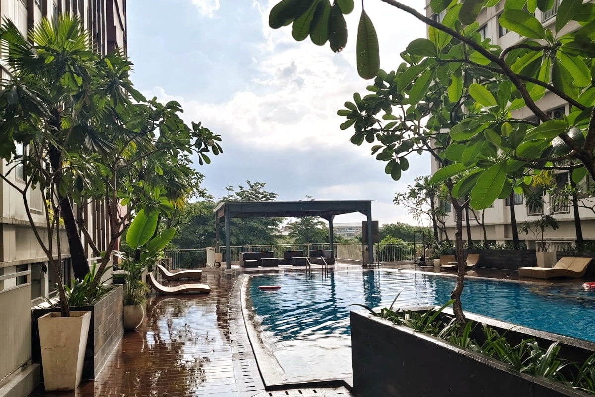 Relájate y desconecta en este alojamiento tranquilo y elegante en el sur de Yakarta, justo al lado de un parque ecológico de 7 hectáreas. Diseño industrial, lujoso apartamento tipo estudio totalmente amueblado: cocina totalmente equipada (estufa, nevera, cafetera Nespresso, todo el equipo de cocina y comedor), TV Android de 43 pulgadas, sofá, cama tamaño queen, baño con ducha caliente. Las instalaciones del edificio incluyen piscina, jacuzzi, gimnasio y plaza de aparcamiento. En el piso 22, tienes una espléndida vista de la ciudad de Yakarta.
